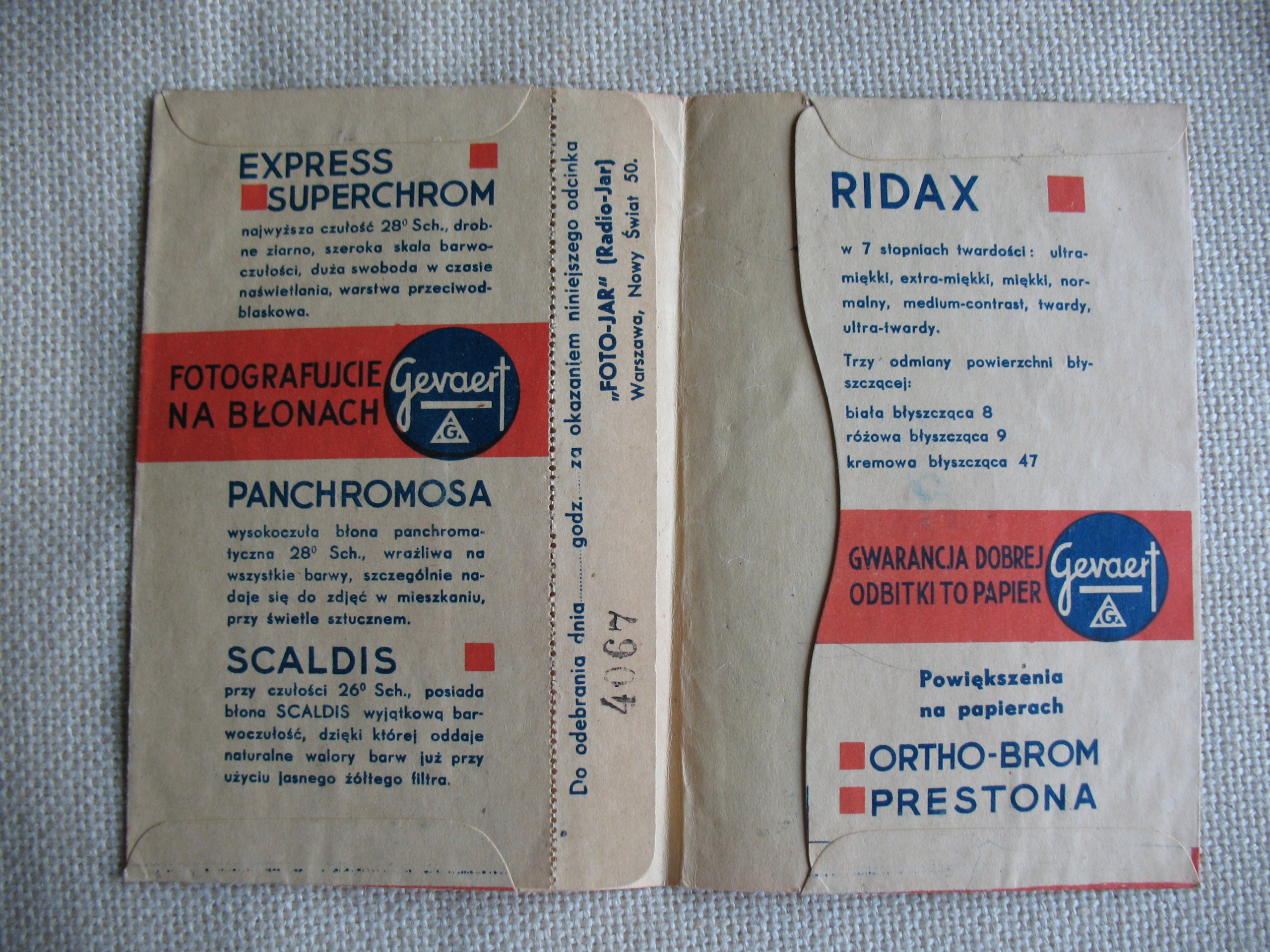 Stare, oryginalne, przedwojenne, papierowe etui na fotografię lub klisze z reklamą wyrobów Firmy Gevaert. Oryginał. Ponadto reklama Zakładu Fotograficznego w Warszawie. Datowanie: lata międzywojenne. Wymiary: 95 x 140 mm. Stan zachowania: według mnie -db, niewielkie zabrudzenia, nadgięcia, naddarcia, wszystko widoczne na skanach. Zapraszam do zakupów.