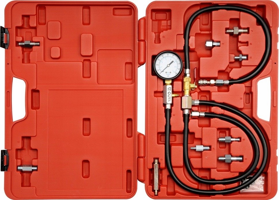 - końcówki i adaptery umożliwiają wpięcie manometru w układ zasilania z jednopunktowym wtryskiem paliwa do kolektora dolotowego, z wielopunktowym wtryskiem paliwa,