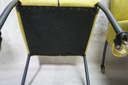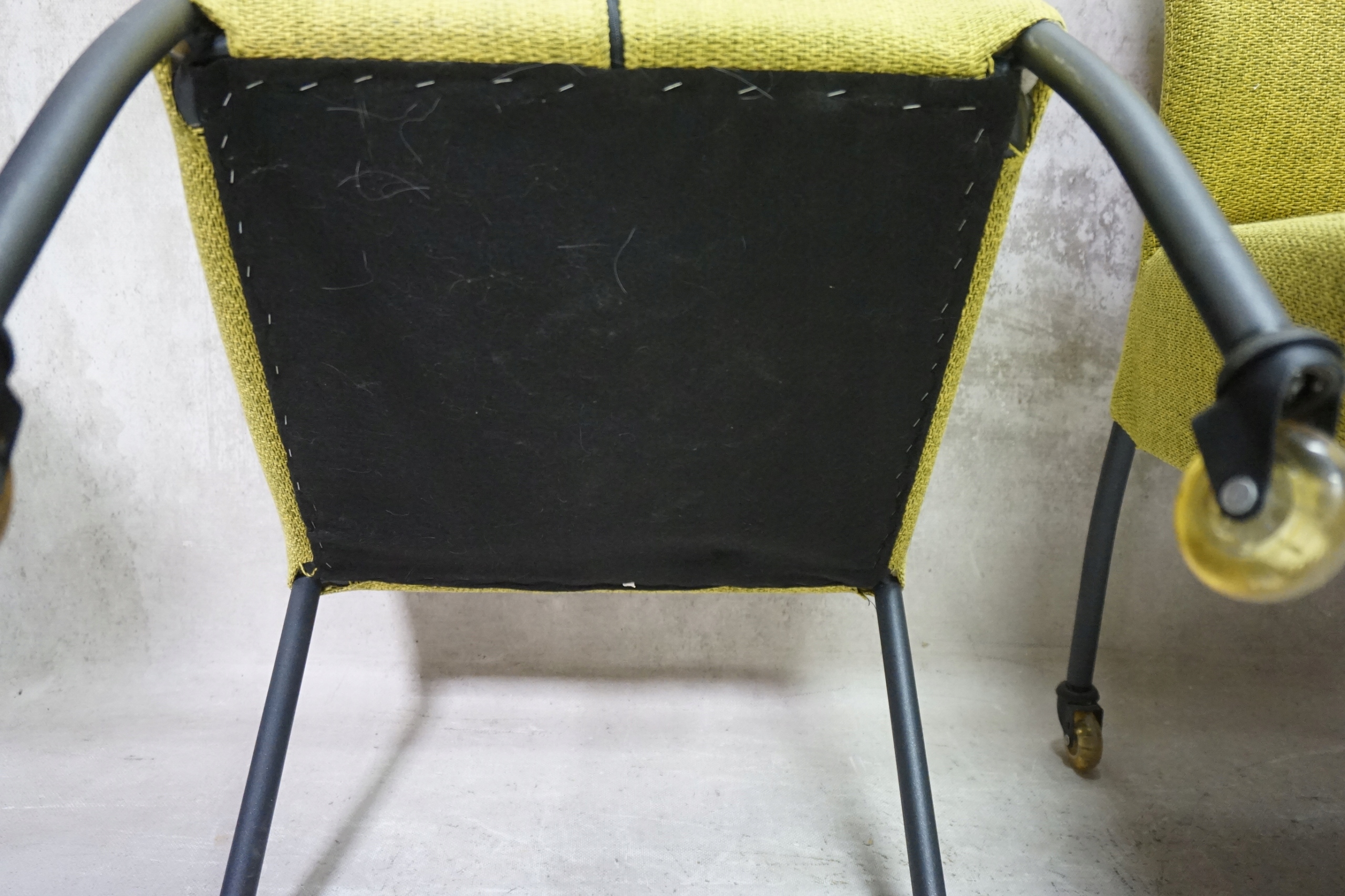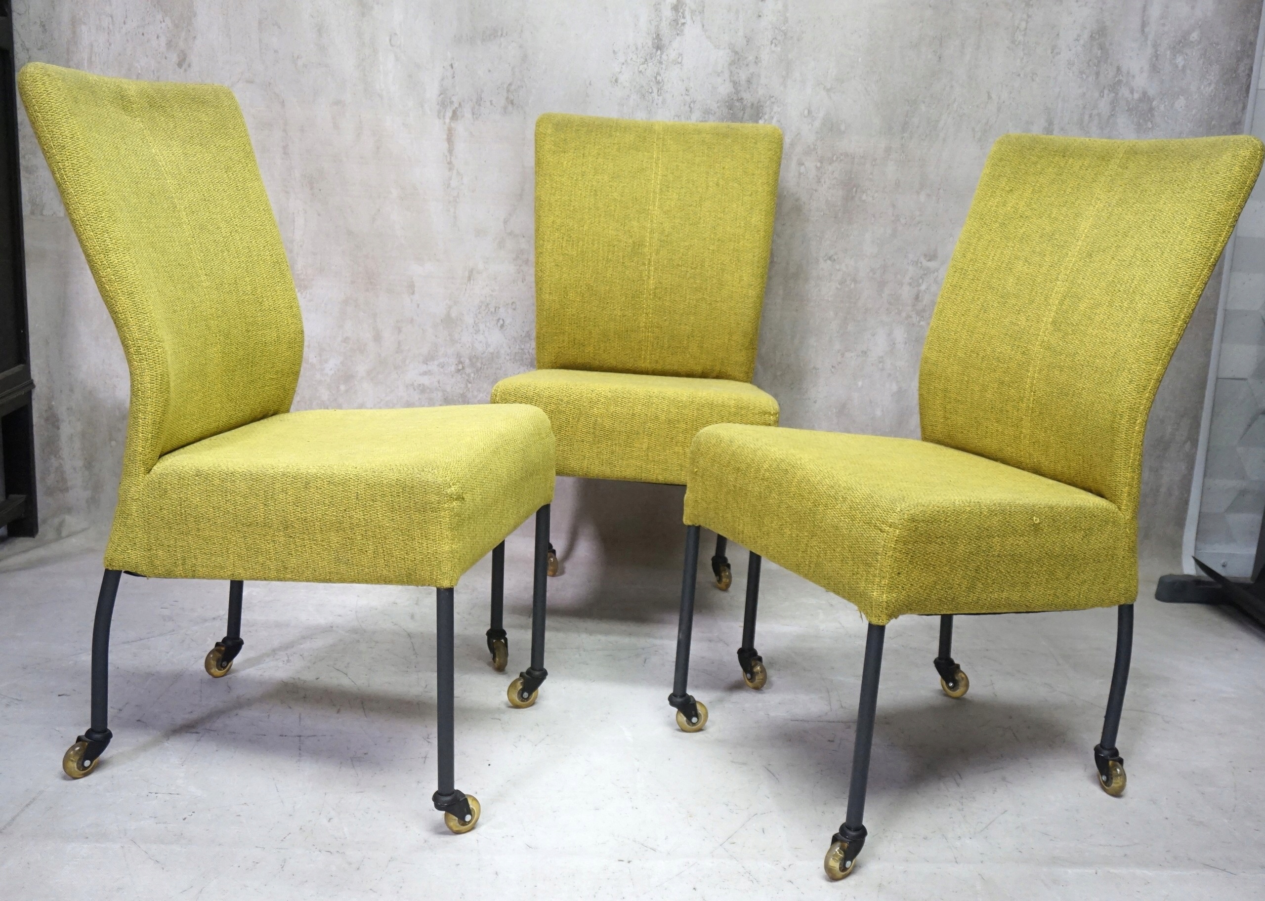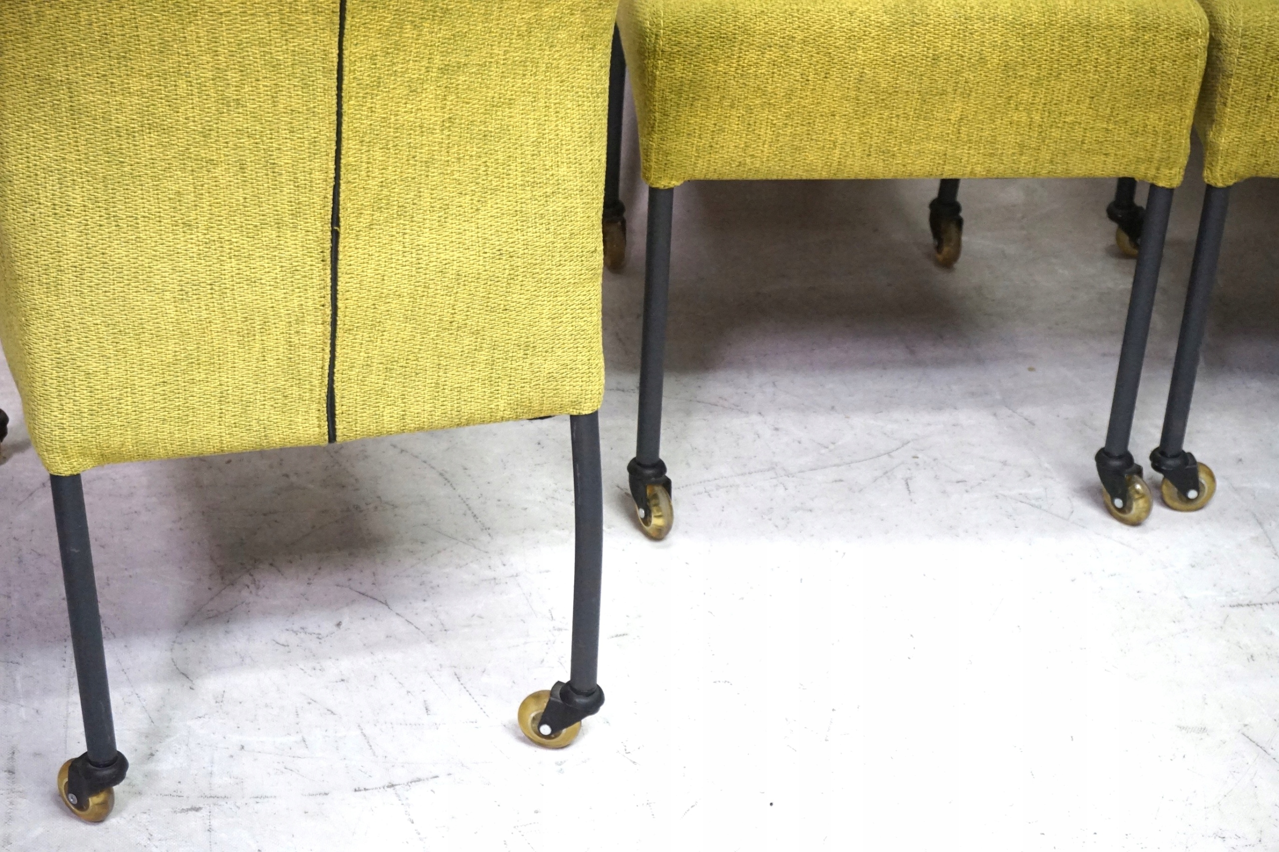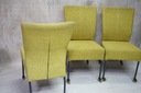 Krzesła o ciekawym designie, z tapicerką w kolorze zielonkawo żółtym.