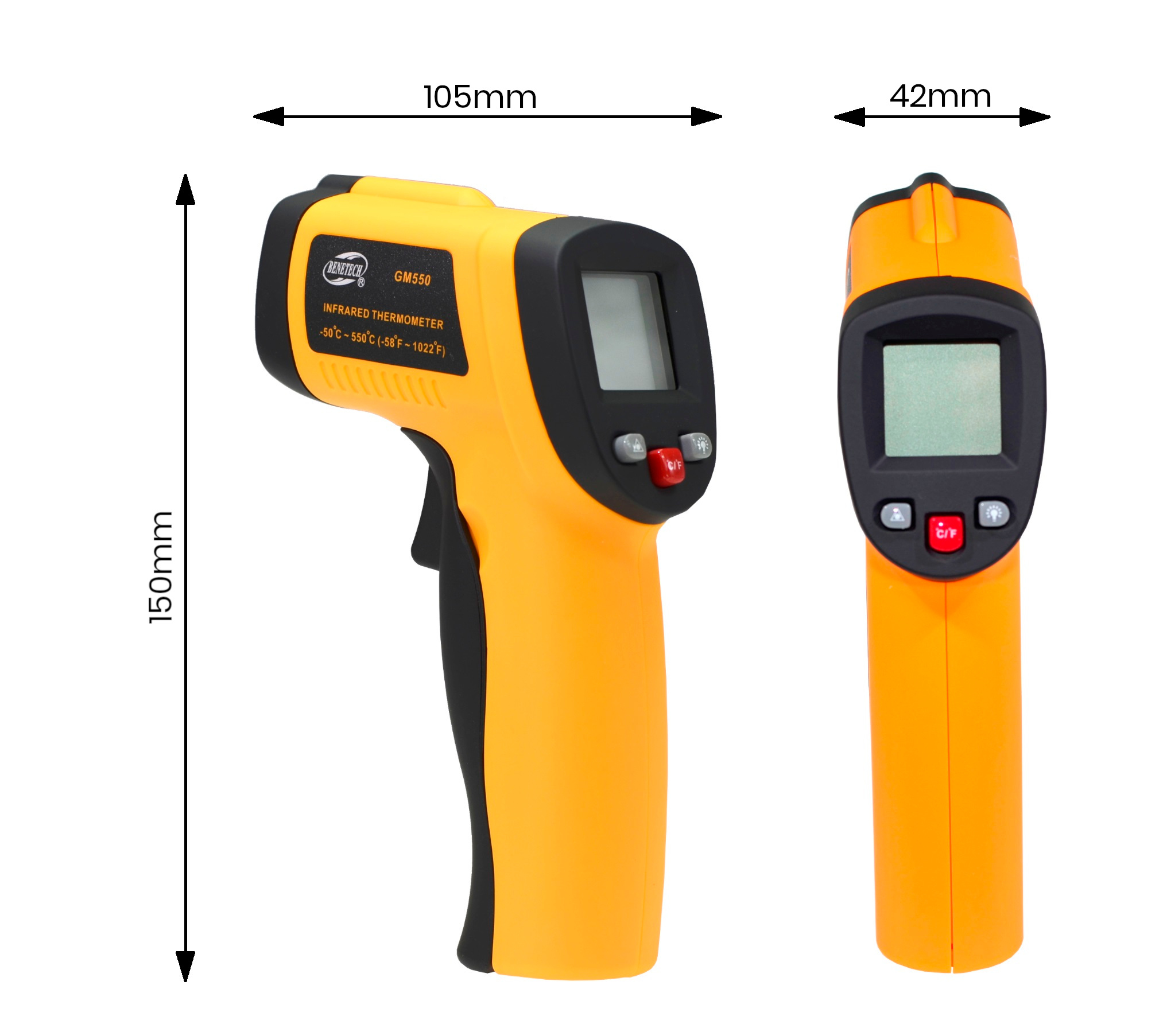 Wysokiej jakości bezkontaktowy termometr wykorzystujący podczerwień do pomiaru temperatury w zakresie od -50 do 550 stopni Celsjusza.