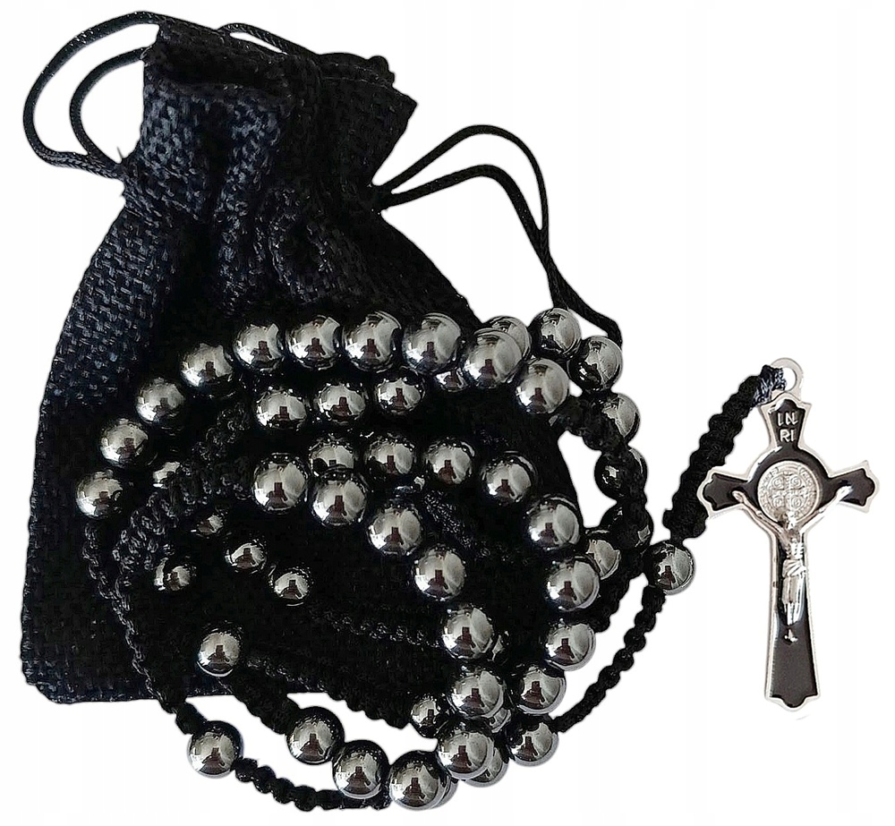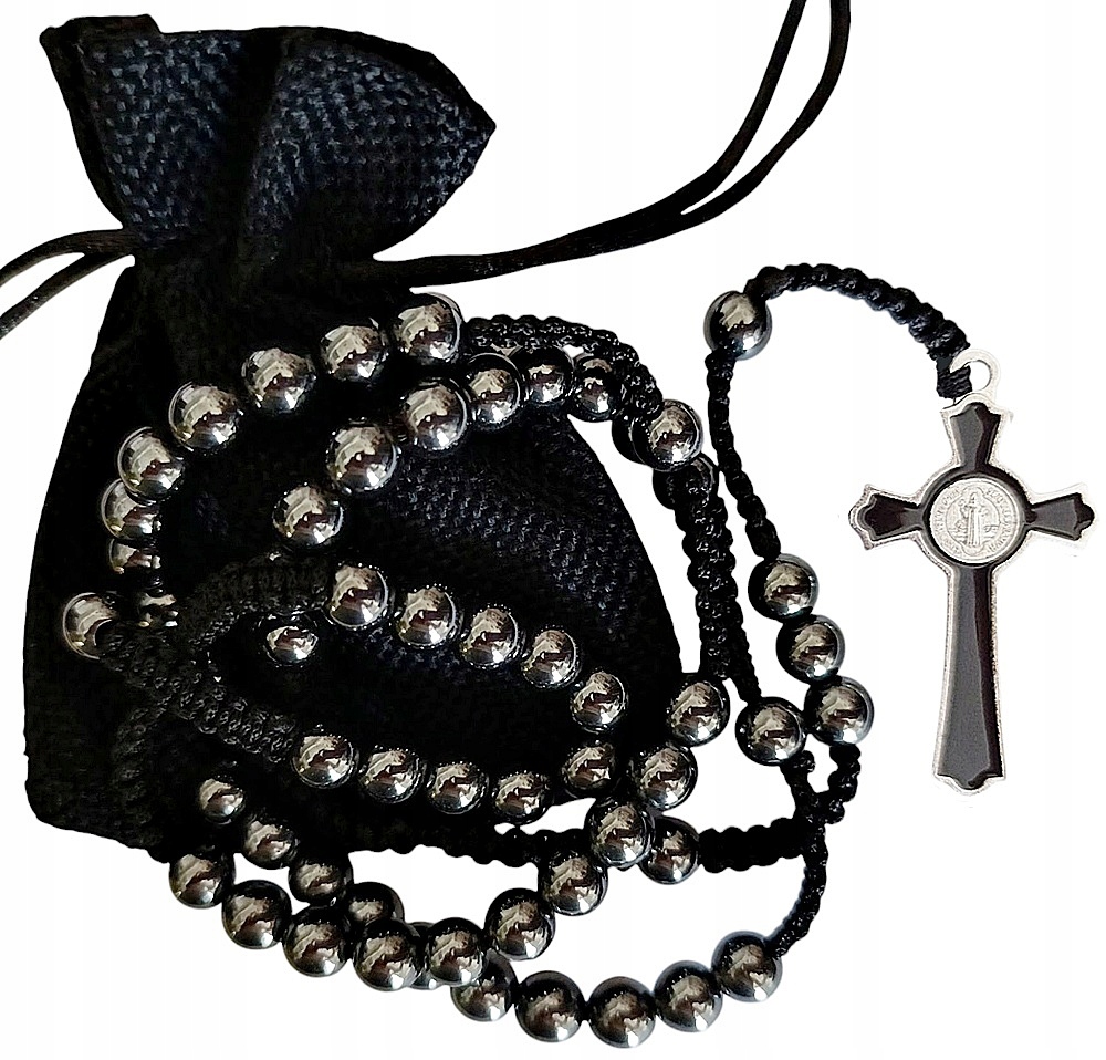 RÓŻANIEC WOJOWNIKA MARYI WYKONANY Z KAMIENIA HEMATYT Z KRZYŻEM Z WIZERUNKIEM ŚW. BENEDYKTA