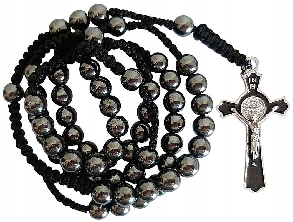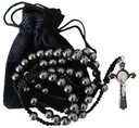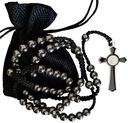 Różaniec wykonany jest z KAMIENIA HEMATYT w kolorze grafitowym.