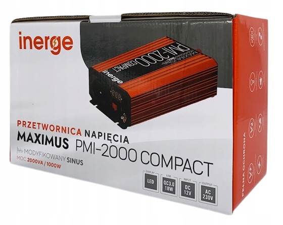 INERGE MAXIMUS przetwarza napięcie prądu stałego 12V na prąd zmienny o napięciu ~230V.