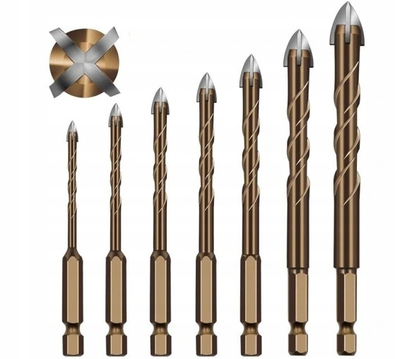 Trwałe ostrza tnące: Każde wiertło składa się z czterech ostrzy tnących wykonanych z węglików spiekanych. Zapewniają trwałość i efektywne wiercenie w materiałach takich jak szkło i płytki ceramiczne.
