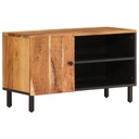 Solidna szafka pod TV została zaprojektowana po to, by stać się centralnym punktem pokoju za sprawą swojego modnego, a zarazem praktycznego designu. Lite drewno akacjowe: lite drewno akacjowe to piękny, naturalny materiał. Jest to twarde drewno tropikalne, cechujące się zwartą strukturą, solidnością i trwałością.Dużo miejsca do przechowywania: szafka pod telewizor zapewnia sporo przestrzeni do przechowywania, będzie idealnym miejscem na Twoje czasopisma, płyty DVD i inne przedmioty.Funkcja ekspozycyjna: solidny blat szafki RTV sprawdzi się idealnie do postawienia przedmiotów dekoracyjnych, takich jak ramki ze zdjęciami czy rośliny.Solidne nogi: żelazne nogi zapewniają solidność i stabilność szafki.