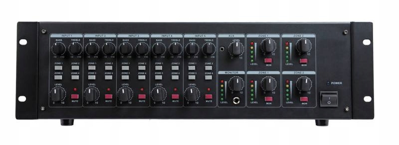 4-strefowy wzmacniacz multiroom. Oznacza to, że dla wszystkich 5 wejść wybierasz (bezpośrednio), w której strefie będzie odtwarzane. W ten sposób w każdej strefie (dostępne są 4 strefy monofoniczne o mocy 60 W każda) "gra" inny sygnał. Docenią to przede wszystkim właściciele pensjonatów, restauracji i innych pomieszczeń socjalnych, w których każda strefa wymaga innego sygnału. Np. w restauracji współczesna muzyka, w pokojach klasyka. Jeśli moc stref jest niewystarczająca, możliwe jest podłączenie wzmacniacza wzmacniającego do każdej strefy. Dzięki tej centrali radiowej właściwie mieszasz różne sygnały, ich wzmocnienie mocy i routing. Wzmacniacz jest przeznaczony do montażu w 19" RACK-u. - moc 4 × 60W rms / 100V,70V, 4Ω- 3 wejścia Mic / Line złącze XLR /Jack 6,3 z przełączanego zasilaniem fantomowym 48 V- 2 wejścia Line przez złącze Cinch- 4 regulowane monofoniczne strefy wyjściowe ze wskazaniem- każde wejście można skierować do różnych stref za pomocą 4 przycisków, w każdym wyjściu. strefa może być więc innym zmiksowanym sygnałem- regulowane poziomy wszystkich wejść + ustawienie czułości + routing do stref + funkcja Mute (wyciszenie wejścia) ze wskazaniem włączenia- każde wejście ma własną 2-pasmową korekcję- całkowite wyjście monitorowania mocy 1W / 8Ω- strefowe asymetryczne. / Sym. Wyjścia sygnałowe na inne wzmacniacze- wbudowana funkcja priorytetu (wyciszanie) przez styk przełączający- ochrona wyjściowa- zniekształcenia THD 70dB / Line, 65dB / Mic- zakres częstotliwości 50-18000Hz / -3dB- zasilanie AC 230V / 50Hz, wymiary 484x132x342mm