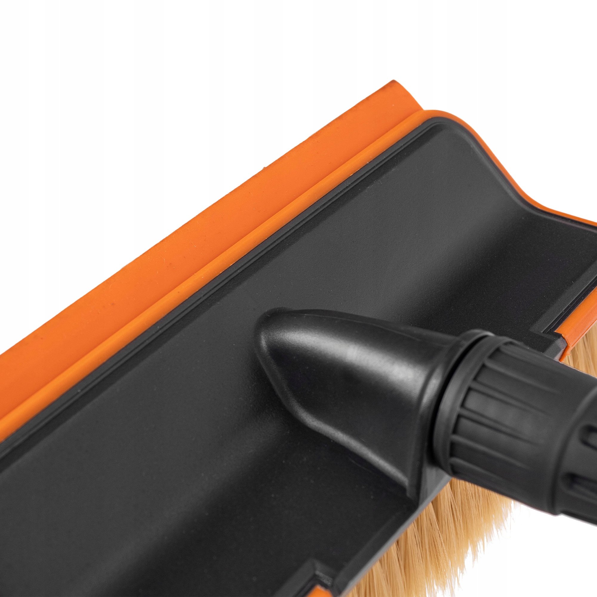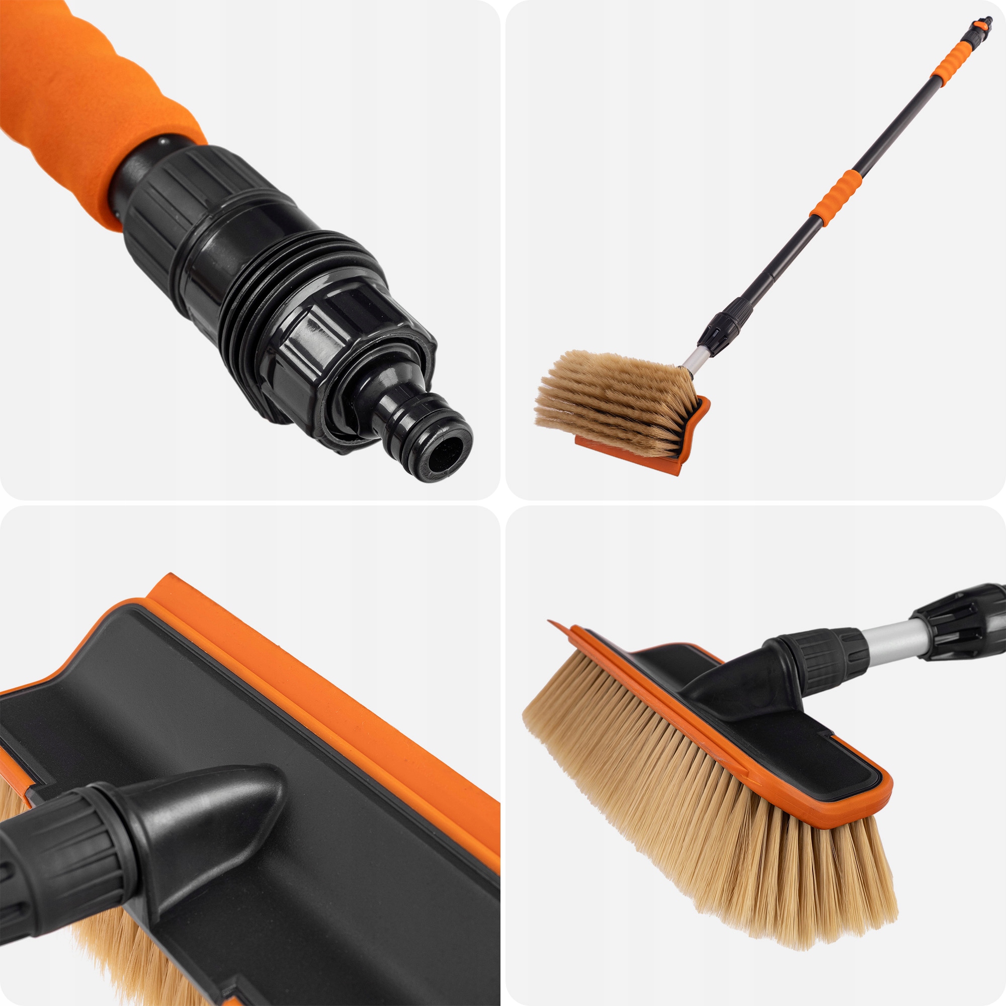 Przełącznik umożliwia oszczędne użycie wody, a dzięki standardowemu nyplowi podłączysz szczotkę do węża ogrodowego w kilka sekund – bez dodatkowych akcesoriów