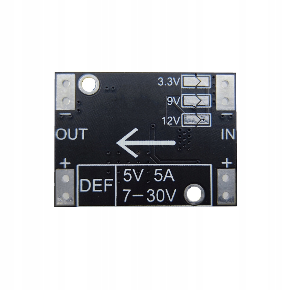 Przetwornica step-down obniżająca napięcie, która z napięcia wejściowego z przedziału 7V do 24V pomoże uzyskać stabilne napięcie, wybrane zworką z tyłu płytki . Do wyboru mamy napięcia wyjściowe: 3.3V, 5V (domyślne), 9V, 12V. Moduł posiada bardzo wysoką wydajność prądową do 5A. Zastosowane komponenty gwarantują bezpieczną i stabilną pracę urządzenia.