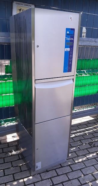 Dezynfektor o wymiarze zewnętrznym 50 x 60cm głębokość x 174cm wysokość. Ma przyłącze ciepłej i zimnej wody. Zasilanie 230V.