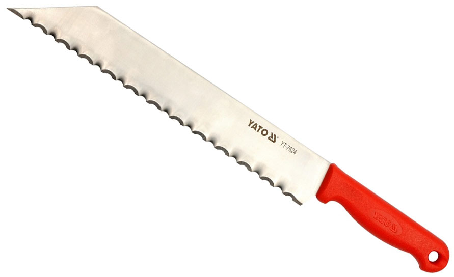 Nóż do skutecznego cięcia izolacji budowlanych, szczególnie polecany przy cięciu rolek i arkuszy wełny mineralnej oraz płyt styropianu.