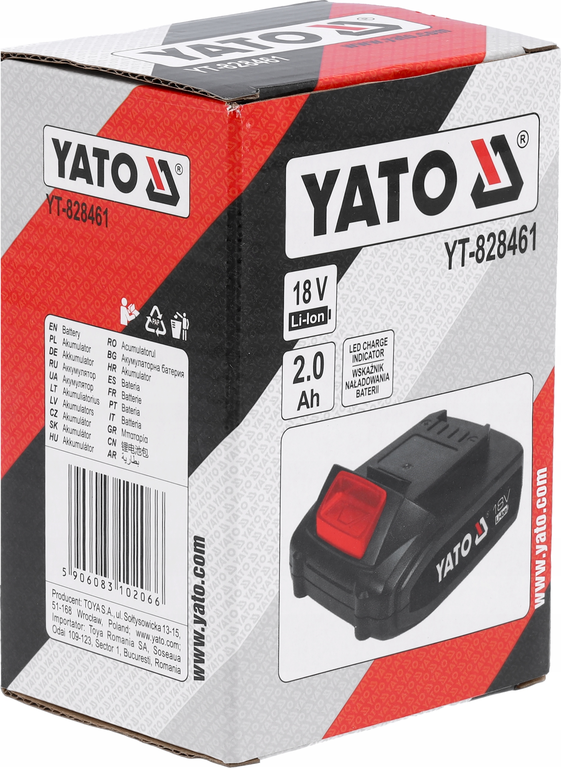 Akumulator zasilający serię elektronarzędzi YATO platformy 18V. Posiada udoskonalony system ochrony ogniw przed przegrzaniem oraz pełnym rozładowaniem w stanie spoczynku. Maksymalny prąd wyjściowy wynosi 30 A, co dla akumulatora 2 Ah jest jednym z najlepszych wyników w tej klasie i pozwala na wielogodzinną pracę z wkrętarką, wyrzynarką i wieloma innymi narzędziami. Akumulator współpracuje ze wszystkimi typami ładowarek systemu YATO 18V, w tym wersjami z wentylatorem lub ładowarką solarną.