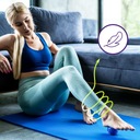 ▶️Stań na jednej nodze, a drugą stopą połóż na piłce z kolcami. Delikatnie dociskaj piłkę stopą, przesuwając ją od pięty do palców, wykonując ruchy w przód i w tył.