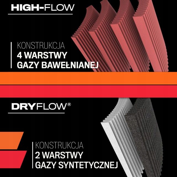 Wybierając filtr nasączony olejem o wysokim przepływie powietrza, będziesz cieszyć się nieprzerwaną wydajnością, ponieważ wymaga on czyszczenia co 10 000 km. Natomiast filtr Dryflow może przejechać nawet do 20 000 km bez konieczności ponownego czyszczenia.