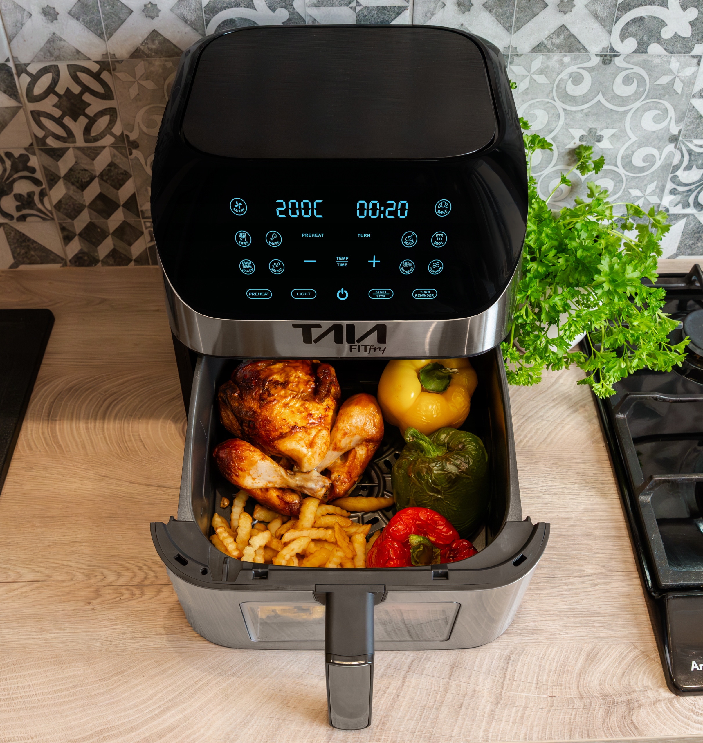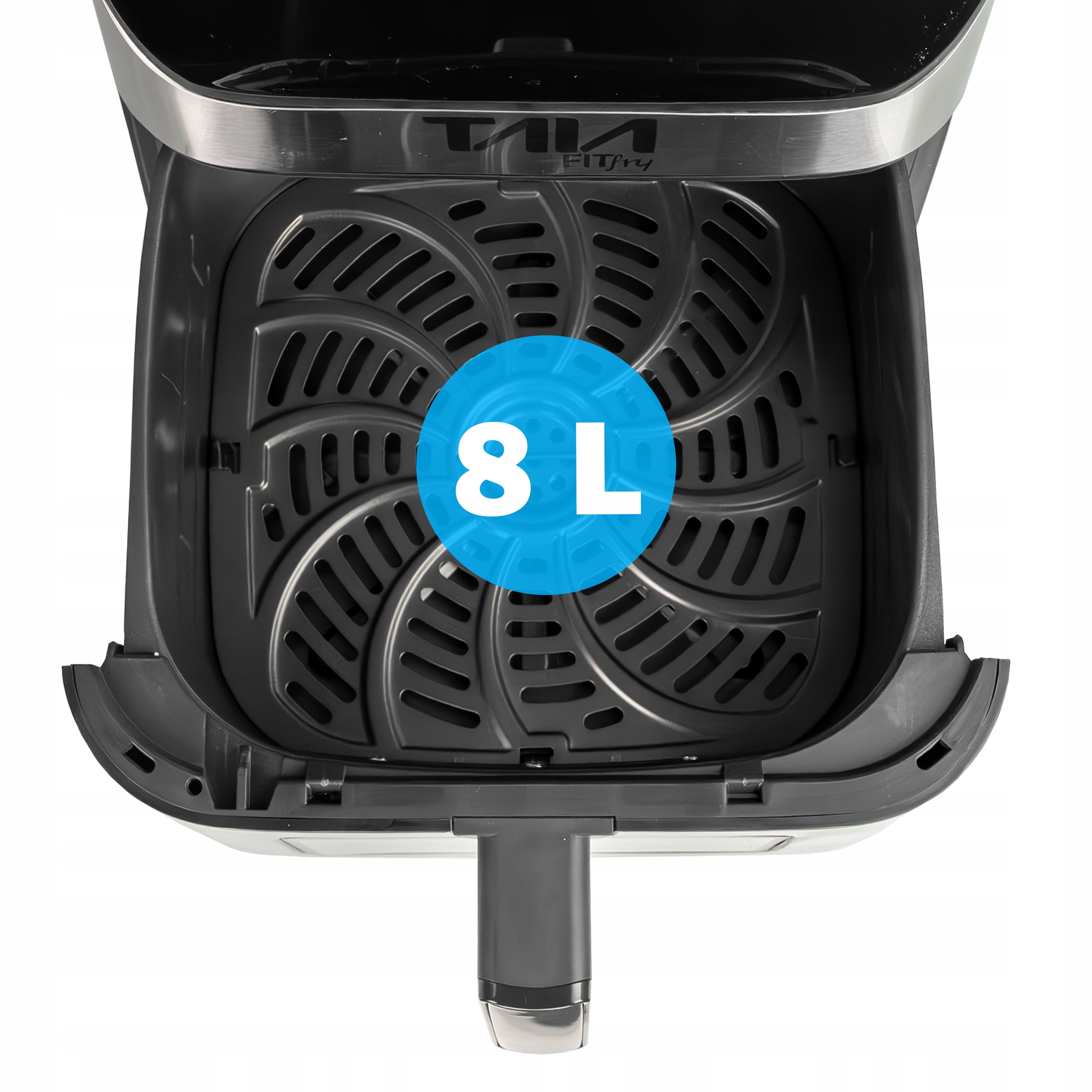 Model FIT FRY marki TAIA to nowoczesna frytkownica beztłuszczowa na gorące powietrze, która dzięki podwójnej komorze pozwala na przygotowanie zdrowych, chrupiących dań bez tłuszczu. Z mocą 1800 W i szerokim zakresem temperatur (80–200 °C) ten air fryer idealnie nadaje się do: