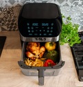 Manualna regulacja temperatury pozwala dopasować warunki pieczenia do każdego dania – od delikatnych warzyw po chrupiące mięsa. Kontrola temperatury umożliwia również przyrządzanie domowych chipsów, wypieków czy podgrzewanie potraw bez wysuszenia.