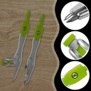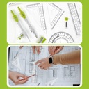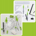 Zestaw geometryczny zawiera wszystkie niezbędne narzędzia do nauki geometrii i matematyki. W skład zestawu wchodzi cyrkiel z uniwersalnym uchwytem oraz cyrkiel z grafitową końcówką, ołówek, linijka o długości 15 cm, dwie ekierki, kątomierz, gumka, temperówka oraz zapasowy grafit.