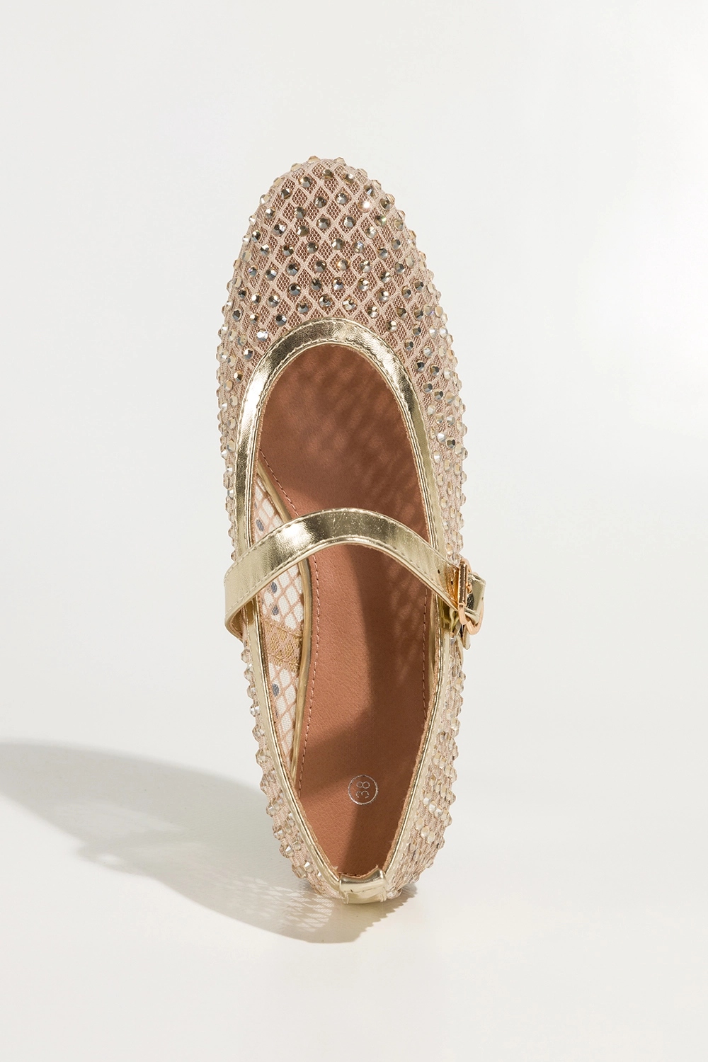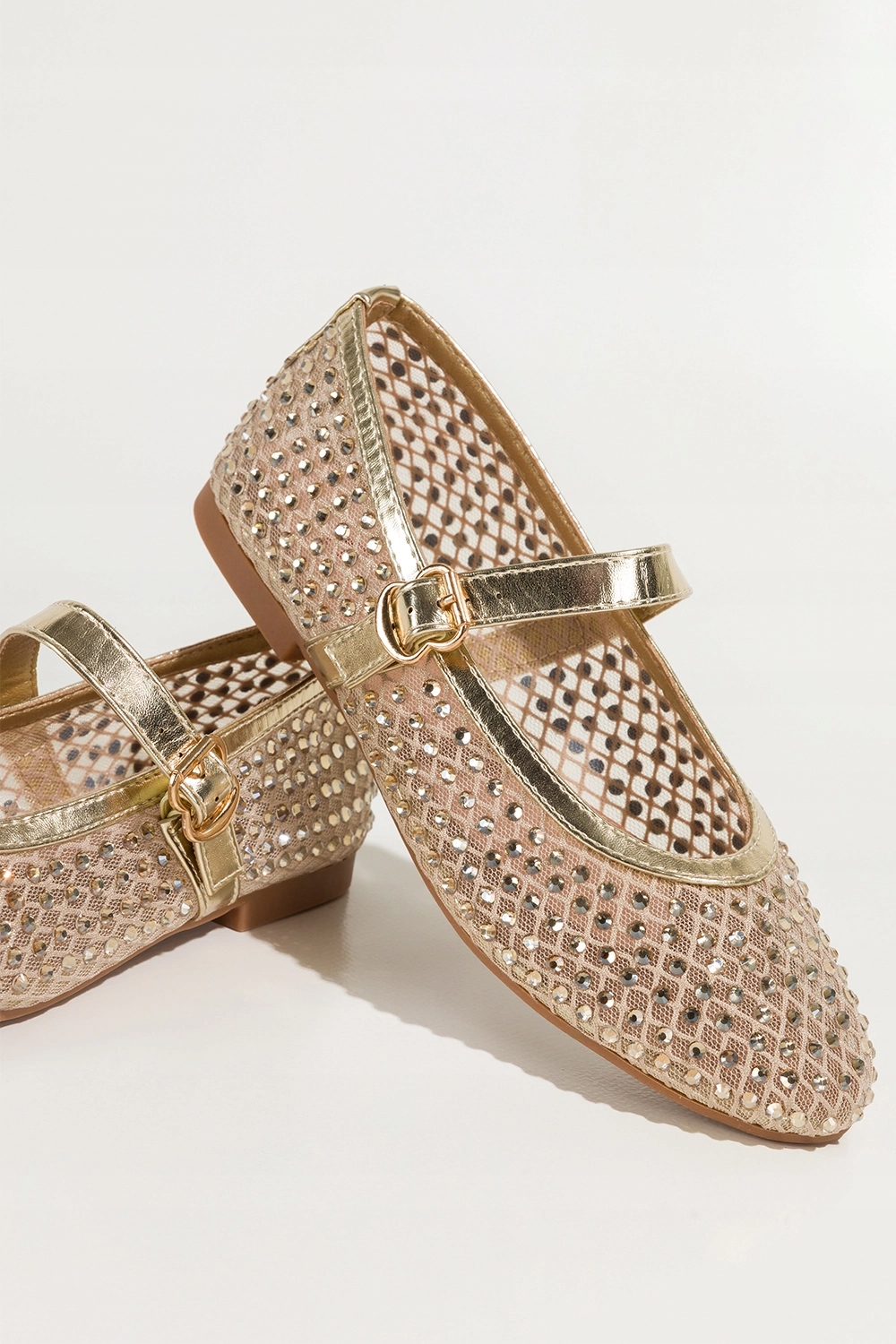Złote baleriny damskie Mary Jane z siateczki pasek na cholewce mieniące kryształki Carla model JH387P to kwintesencja kobiecego uroku, wygody i subtelnego luksusu w codziennym wydaniu. Ten model to nie tylko modny dodatek, ale przede wszystkim funkcjonalne obuwie, które łączy w sobie efektowny design i wyjątkowy komfort użytkowania. Baleriny to idealne rozwiązanie dla kobiet poszukujących butów, które zachwycają wyglądem, ale też sprawdzą się podczas długiego dnia – zarówno w pracy, jak i na specjalne okazje. Starannie zaprojektowane z dbałością o każdy detal, przyciągają wzrok dzięki połyskującym kryształkom i złotemu wykończeniu, które wpisuje się w najnowsze trendy sezonu.