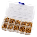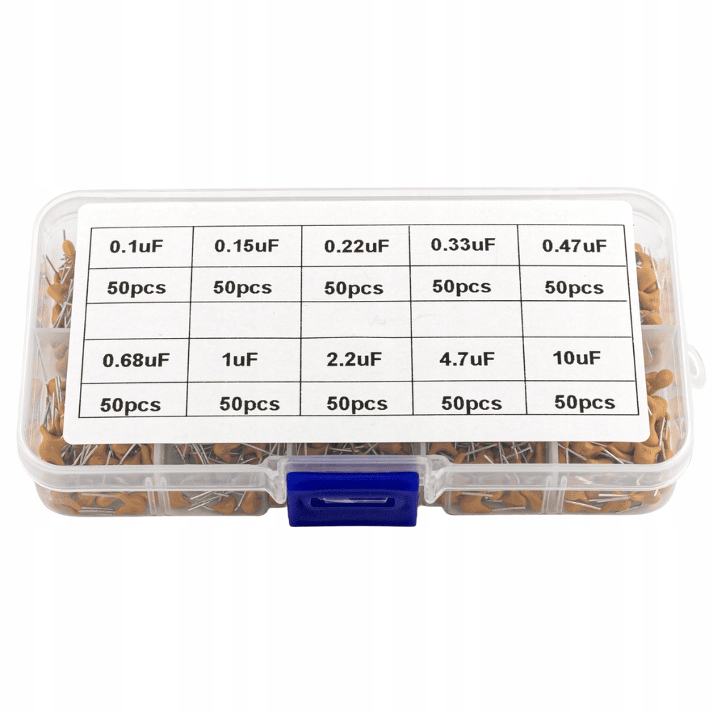Zestaw 500 sztuk kondensatorów ceramicznych, zapakowanych w minimalistyczny organizer. Pudełko zawiera 10 najpopularniejszych wartości po 50 sztuk z każdej.