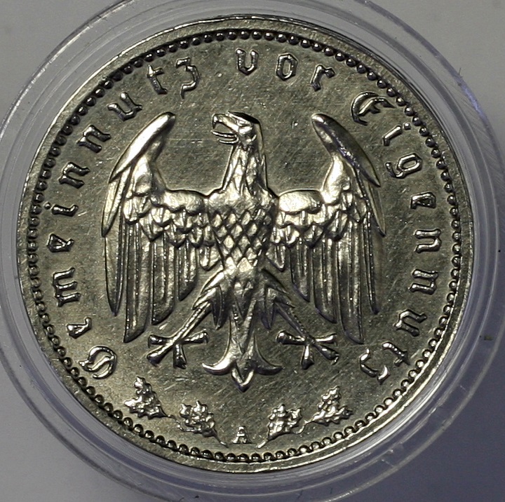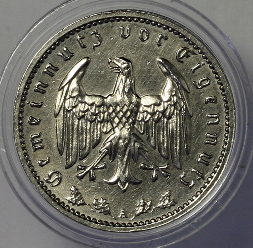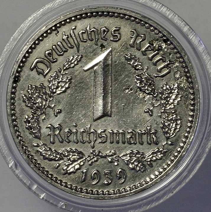 Oferuję monetę NIEMIEC III RZESZY 1 REICHSMARKĘ 1939 rok Mennica A- BERLIN w ładnym stanie zachowania widocznym na załączonych zdjęciach. Moneta wybita w niklu. Polecam.