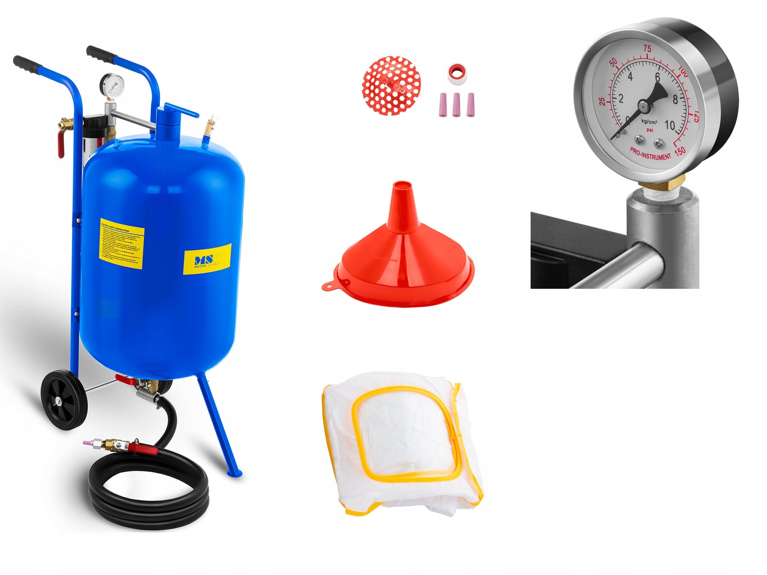 Rozpylanie piasku lub innego materiału ściernego z maksymalnym ciśnieniem 9 bar zapewnia dużą skuteczność. Wysokość parametru pokazuje manometr. Maszynę wyposażono w wąż o długości 2,5 m z zaworem zamykającym, co pozwala komfortowo manewrować urządzeniem. Zawór bezpieczeństwa i regulator powietrza chronią przed za wysokim ciśnieniem, a separator przed przedostaniem się wody do układu ciśnieniowego.