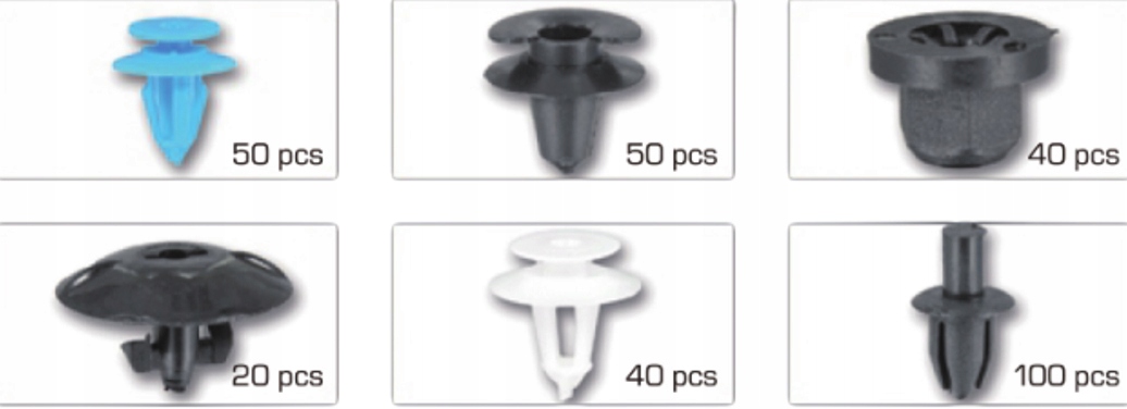 Zestaw plastikowych spinek do samochodów marki Opel Opakowanie zwiera 6 typów spinek, razem 300 spinek. Całość zapakowana w pudełko z wygodnymi przegródkami.