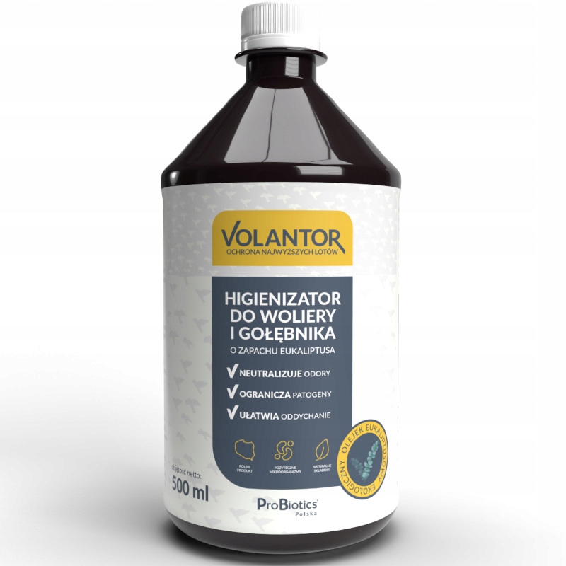Volantor Higienizator do woliery i gołębnika biodezynfekuje gołębniki, woliery i karmniki, przyspiesza proces rozkładania i wysuszania odchodów, ogranicza rozwój patogenów w gołębniku, zasiedla gołębnik pożyteczną mikroflorą, neutralizuje odory, wzmacnia układ oddechowy gołębi, pozostawia odświeżający zapach eukaliptusa.