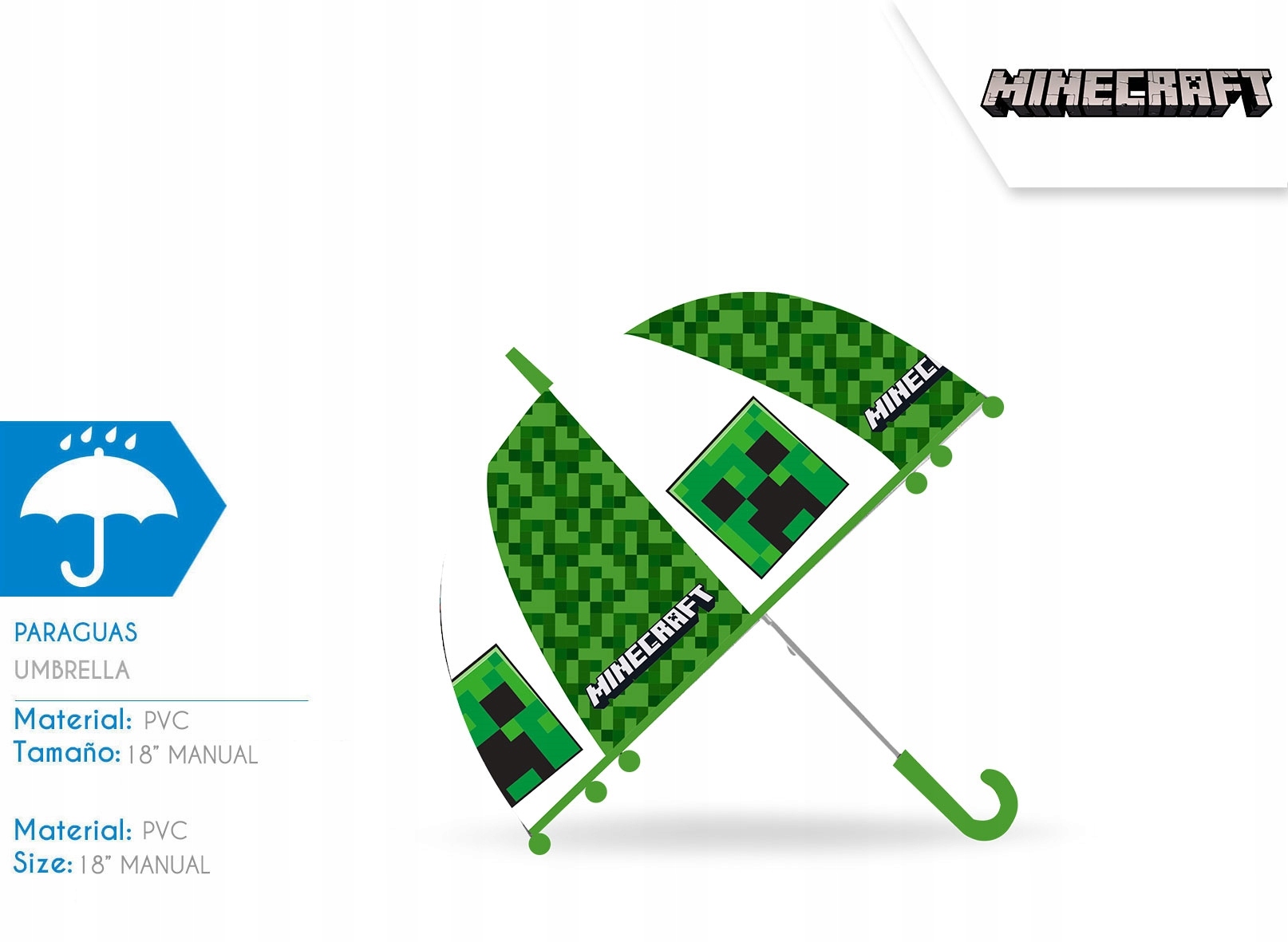 Parasolka Minecraft, manualna, przezroczysta, zapewni doskonałą ochronę dziecko zarówno przed deszczem jak i słońcem. Prosta i łatwa w obsłudze. - Parasolka - Wymiary: 48 cm - Materiał: Poliester, Aluminium, Plastik, Włókno szklane - Waga: 290 g