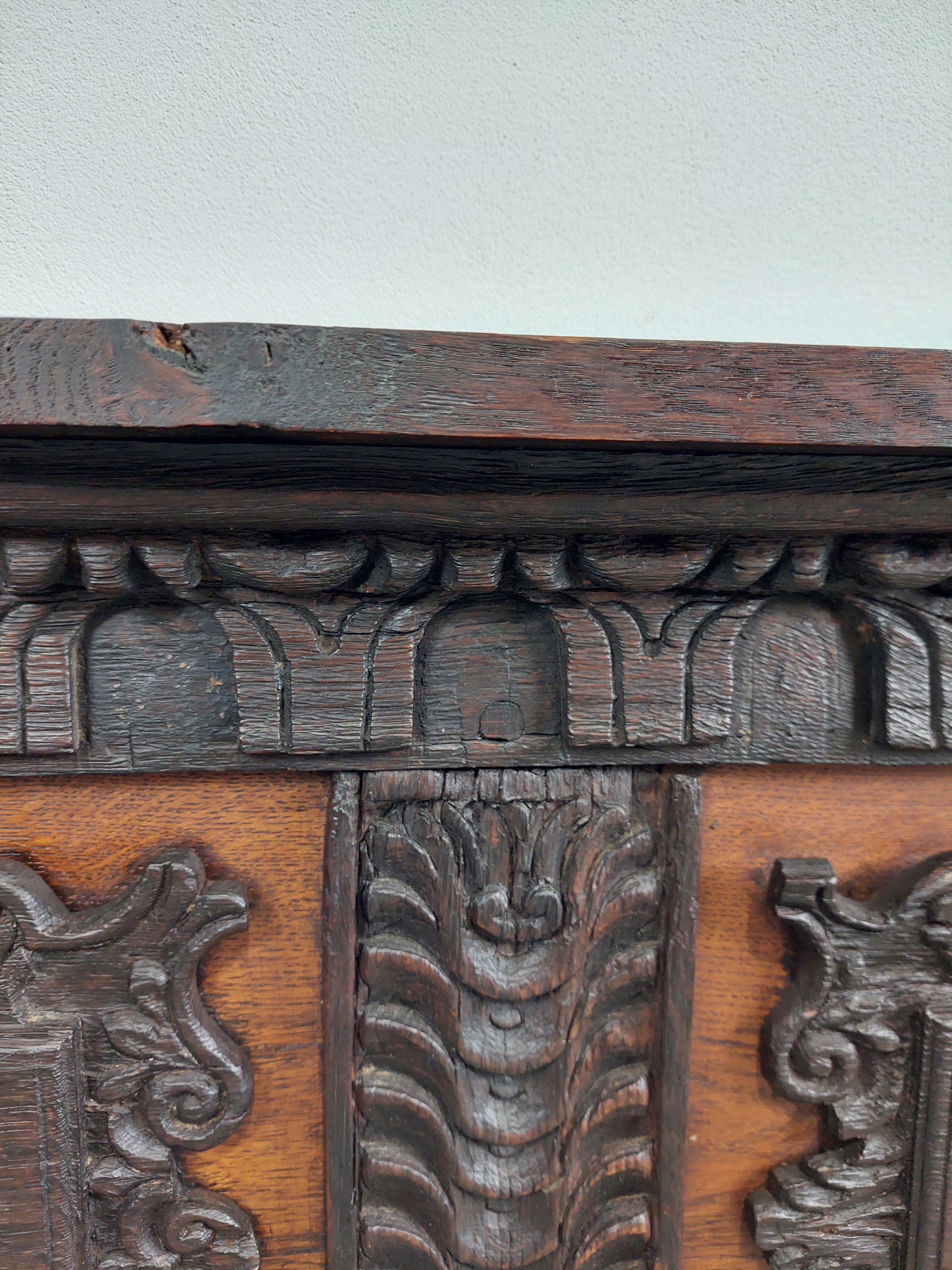 Stylowy neorenesansowy dębowy panel naścienny / półka kominkowa z litej dębiny z piękną snycerką. przedmiot unikatowy, szacunkowo liczy sobie 200 lat. Przywieziony z Francji, całość mocowana na trzech żeliwnych porządnych uchwytach. Minimalne ślady użytkowe. Szczegóły pokazane są na zdjęciach.
