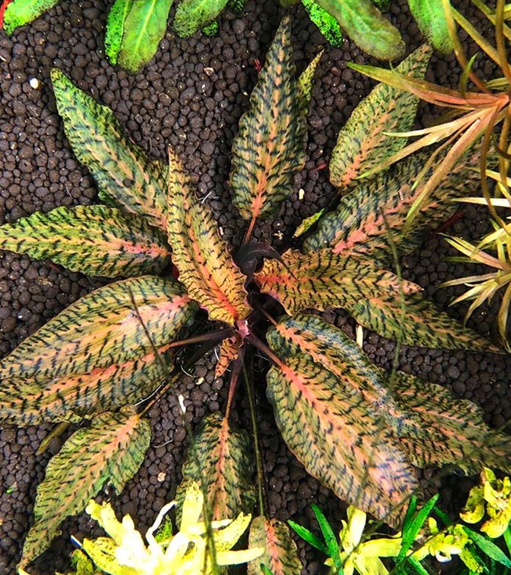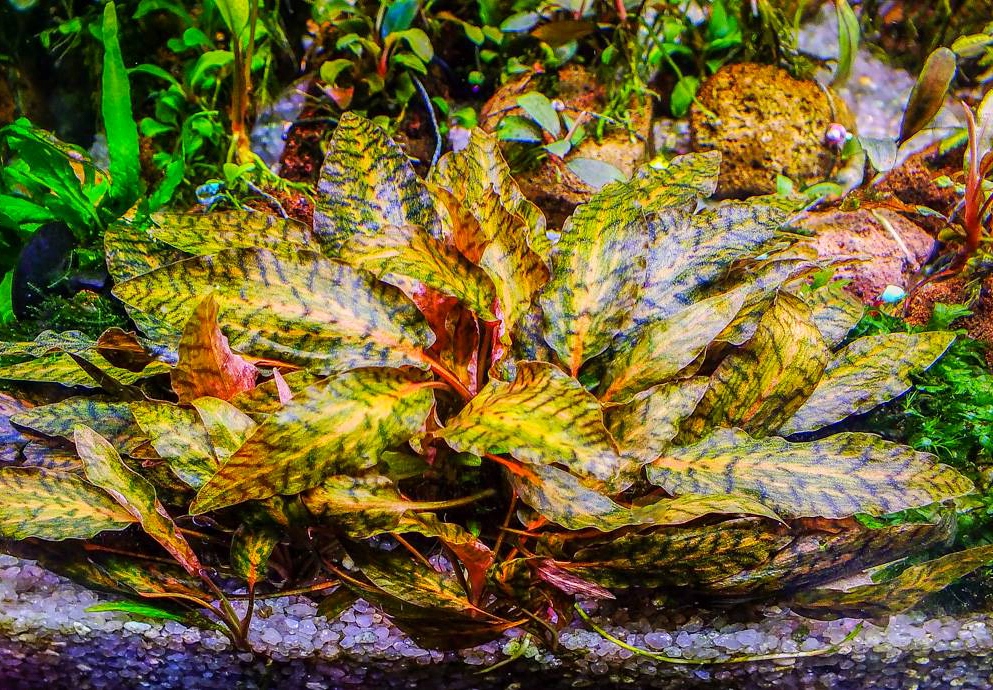 Rzadka i atrakcyjna roślina akwariowa o dekoracyjnych liściach z charakterystycznym tygrysim żebrowaniem.