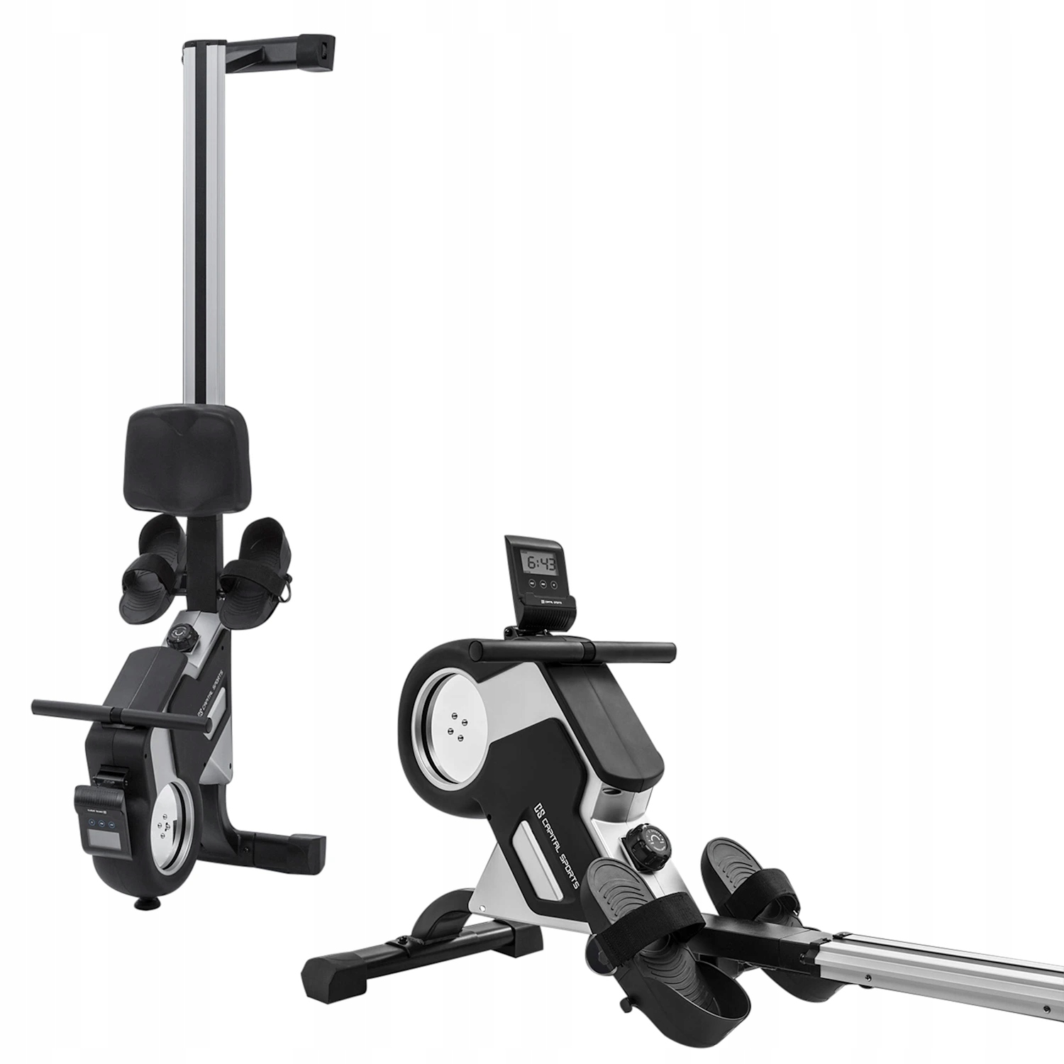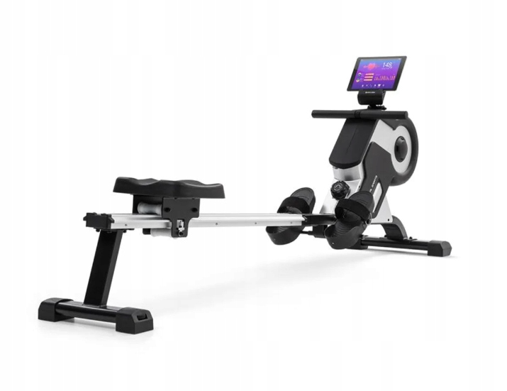 Aby monitorować swój trening, wioślarz Stream M1 marki Capital Sports posiada minikomputer z wyświetlaczem LCD, na którym możesz zobaczyć swoje pociągnięcia, pokonany dystans czy zużyte kalorie. Do odbioru danych z opaski mierzącej tętno służy zintegrowany odbiornik. Wyświetlacz posiada również uchwyt na tablet, dzięki czemu możesz cieszyć się ulubionymi programami lub muzyką podczas wiosłowania. Podnóżki z paskami na rzepy zapewniają stabilną pozycję. Po zakończeniu treningu wioślarza można łatwo przechowywać, oszczędzając miejsce: przesuń go dowolnie za pomocą kółek podłogowych i ustaw szynę ślizgową pionowo.