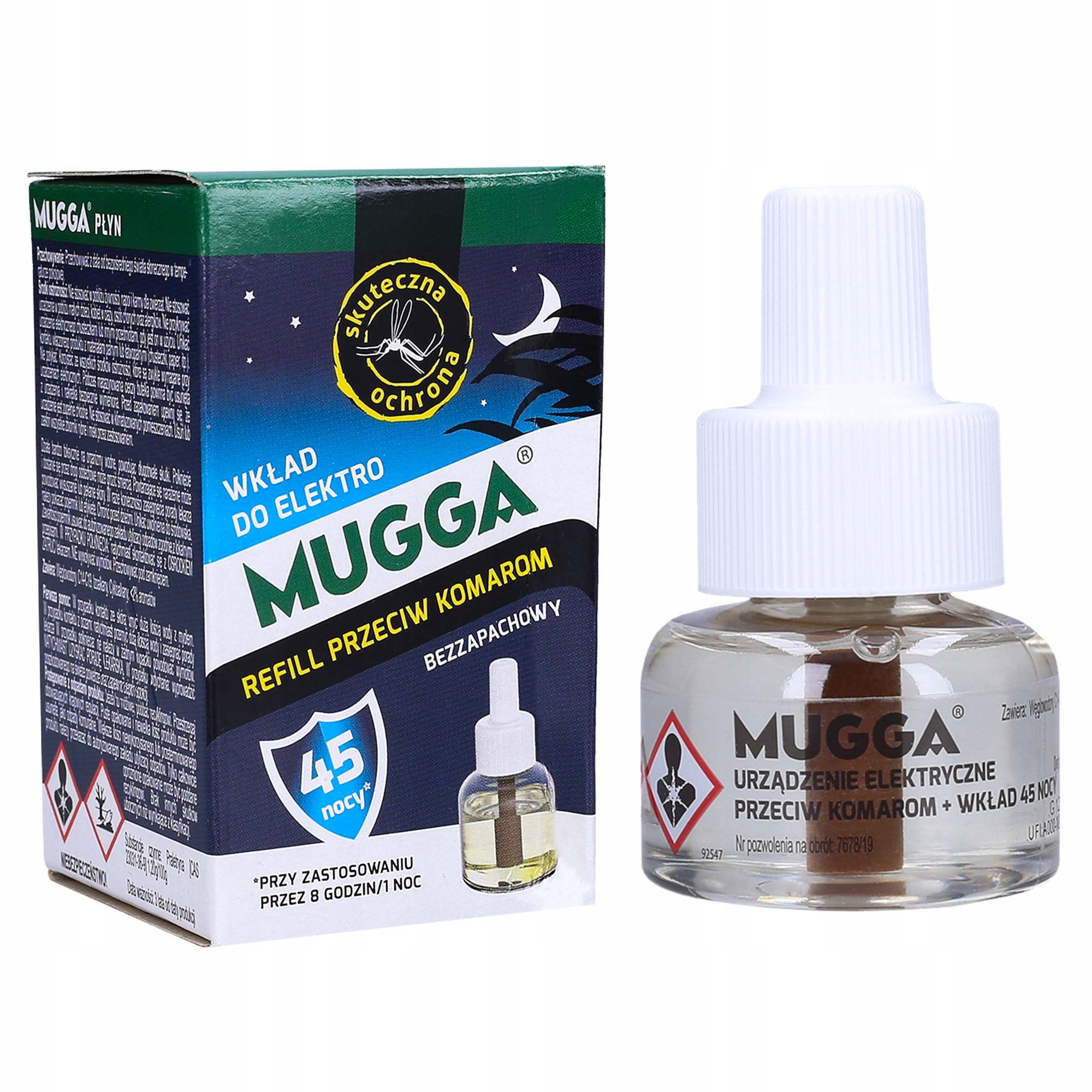 Bezzapachowy płyn do napełniania użyty razem z urządzeniem elektrycznym MUGGA (MuggaPolska.PL) zapewnia ochronę przez 8 godzin co noc w pomieszczeniach o objętości 30 metrów sześciennych. Aby uzyskać lepszą ochronę na większej powierzchni należy użyć więcej parującego produktu.