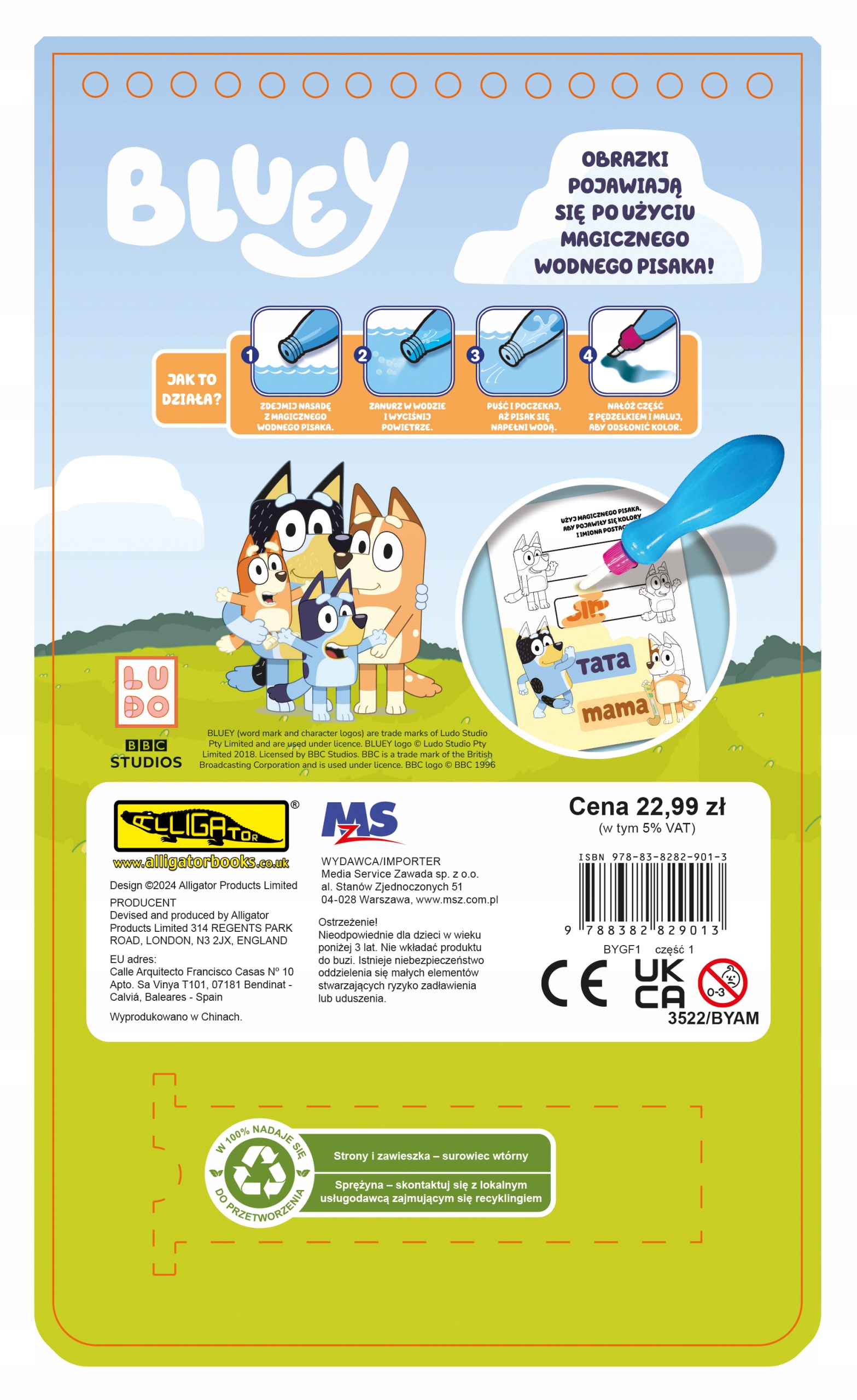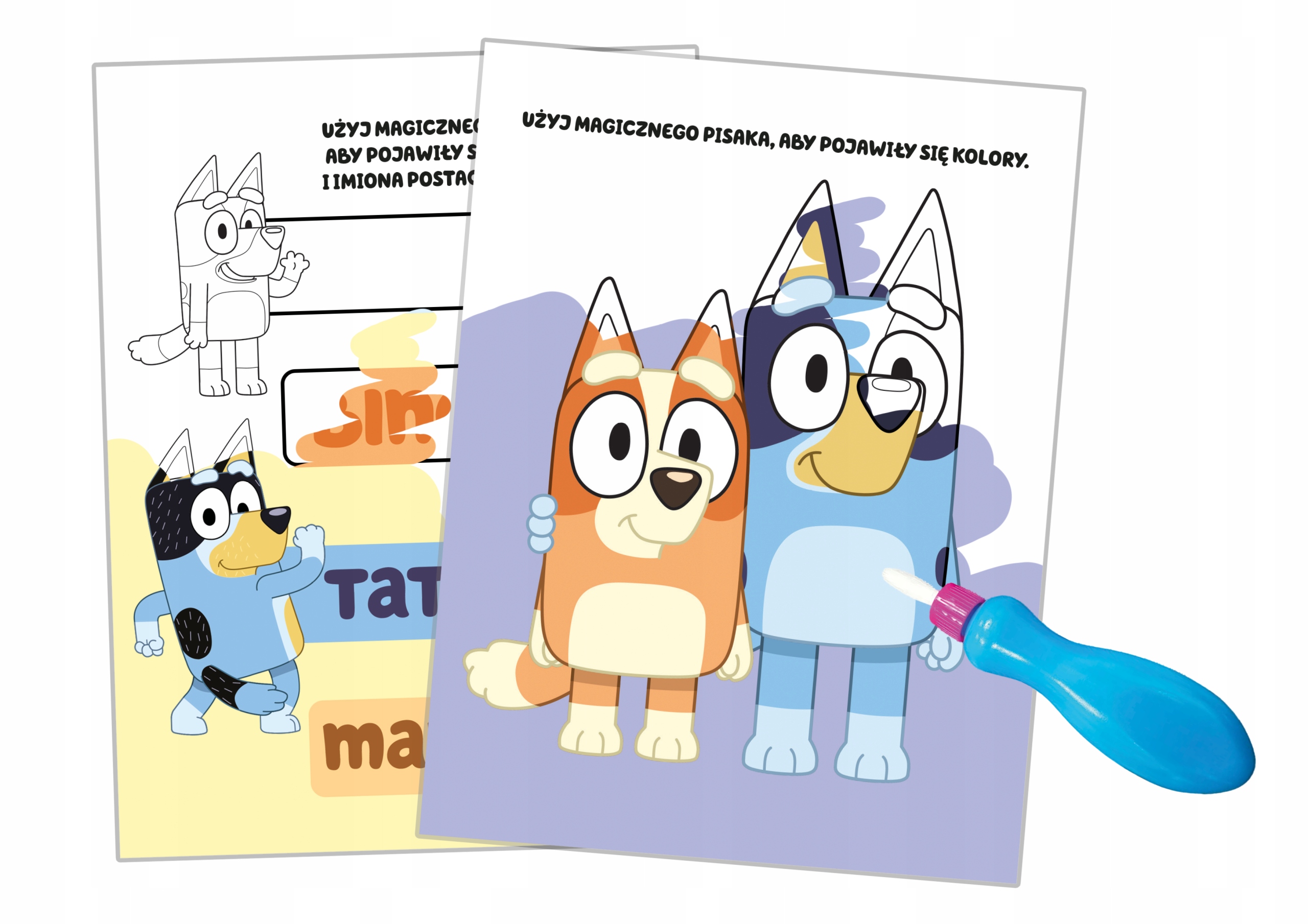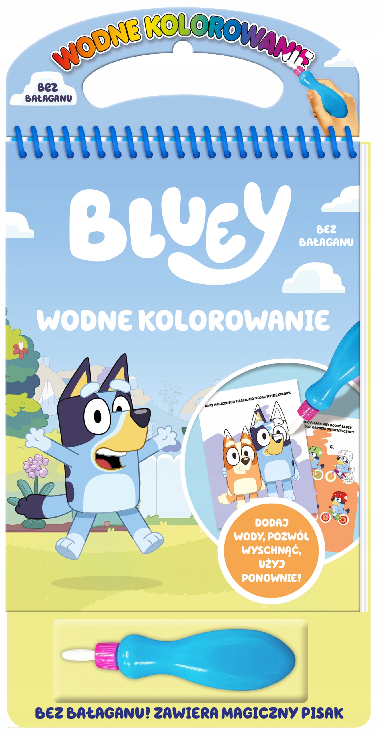 Magia wody, która ożywia świat Bluey – i znika, by zabawa mogła trwać bez końca! To nie jest zwykła kolorowanka – to książka, w której każdy ruch pisaka zamienia białą stronę w kolorową przygodę z Bluey, Bingo, Chilli i Banditem! Napełnij wodny pisak, pociągnij nim po ilustracjach i zobacz, jak ukryte obrazki nagle się pojawiają. A kiedy wyschną – znikają! I wszystko zaczyna się od nowa. Wspaniała zabawa bez bałaganu, którą można zabrać dosłownie wszędzie.