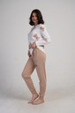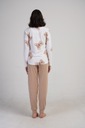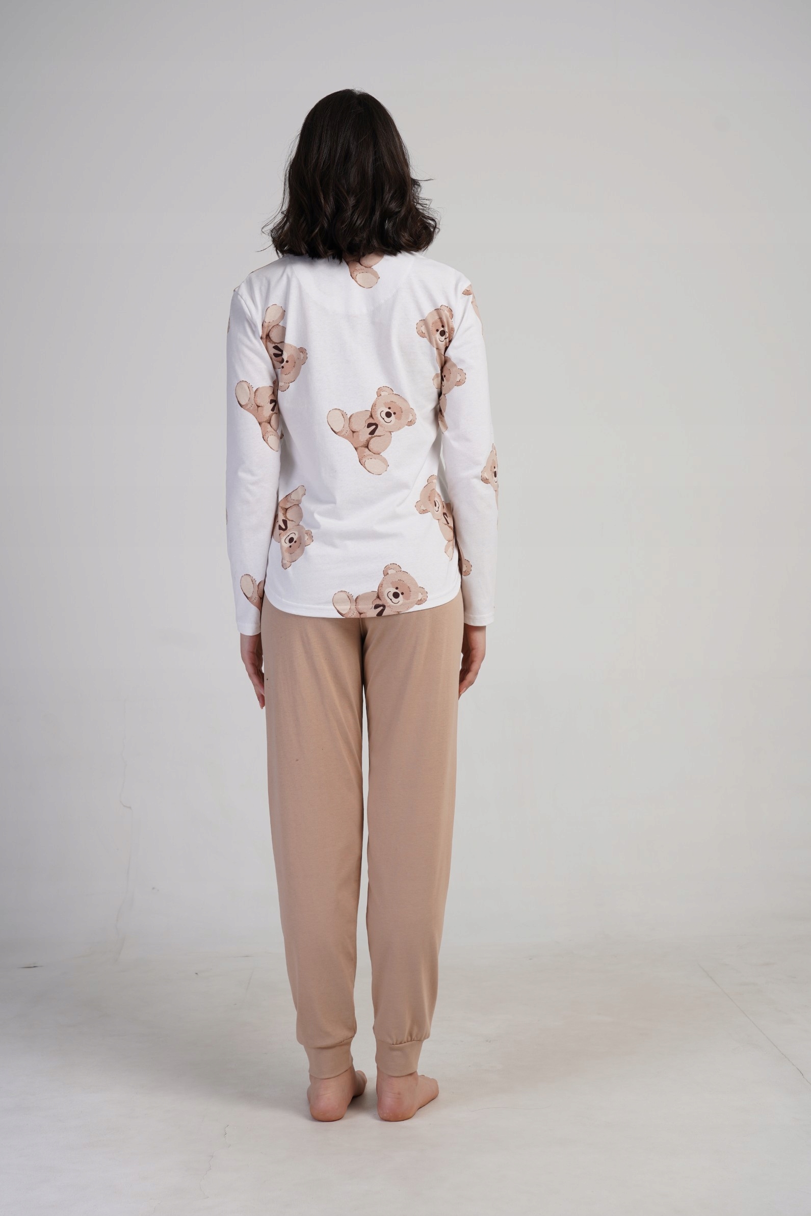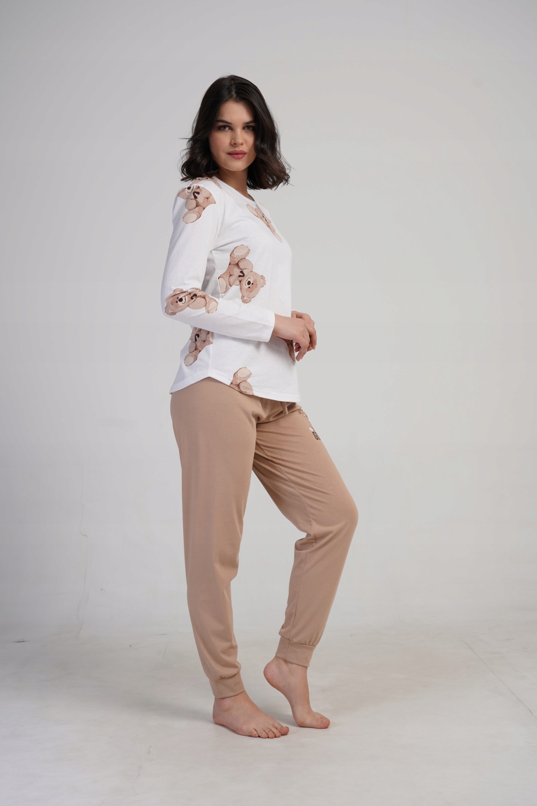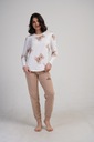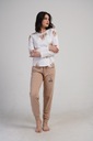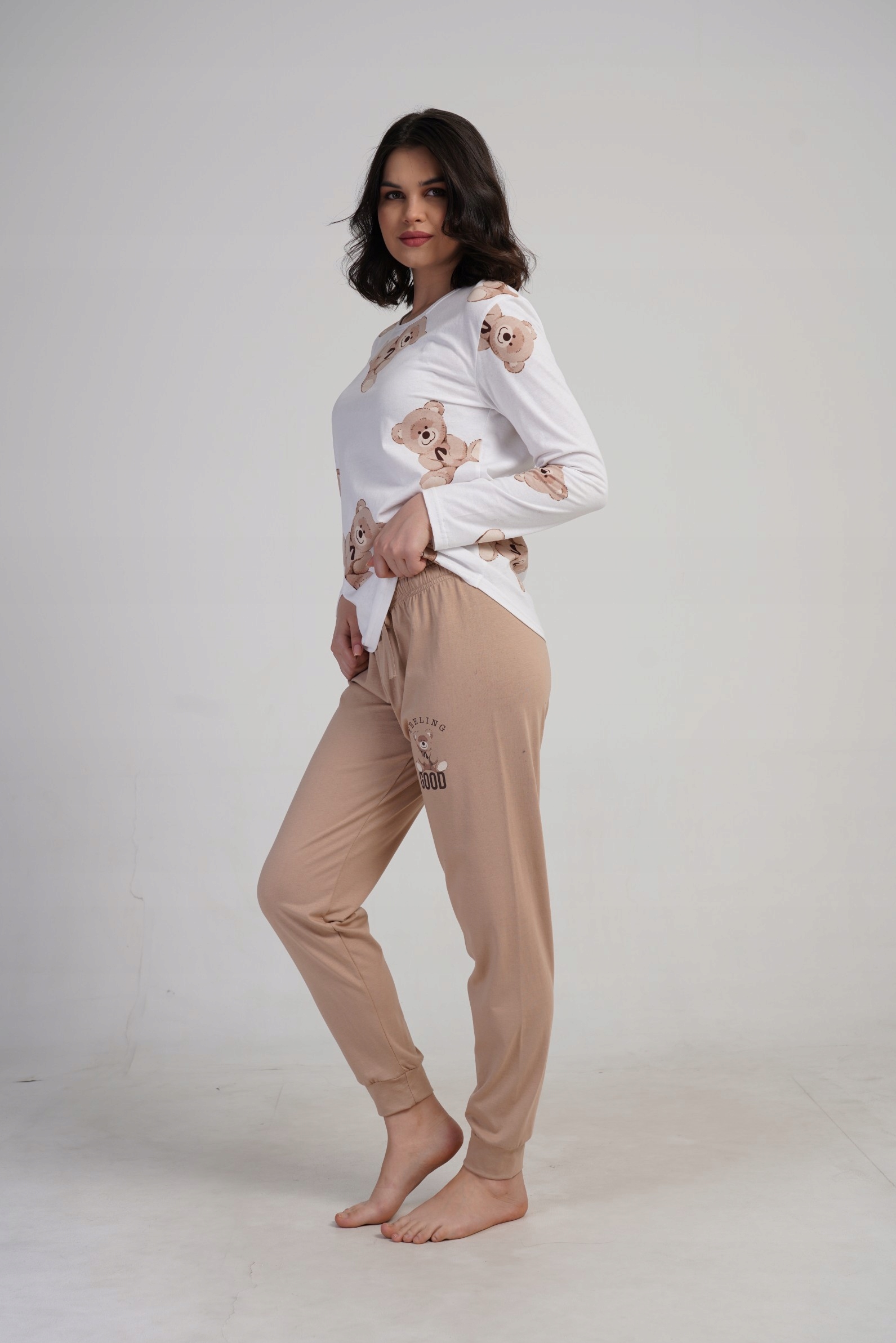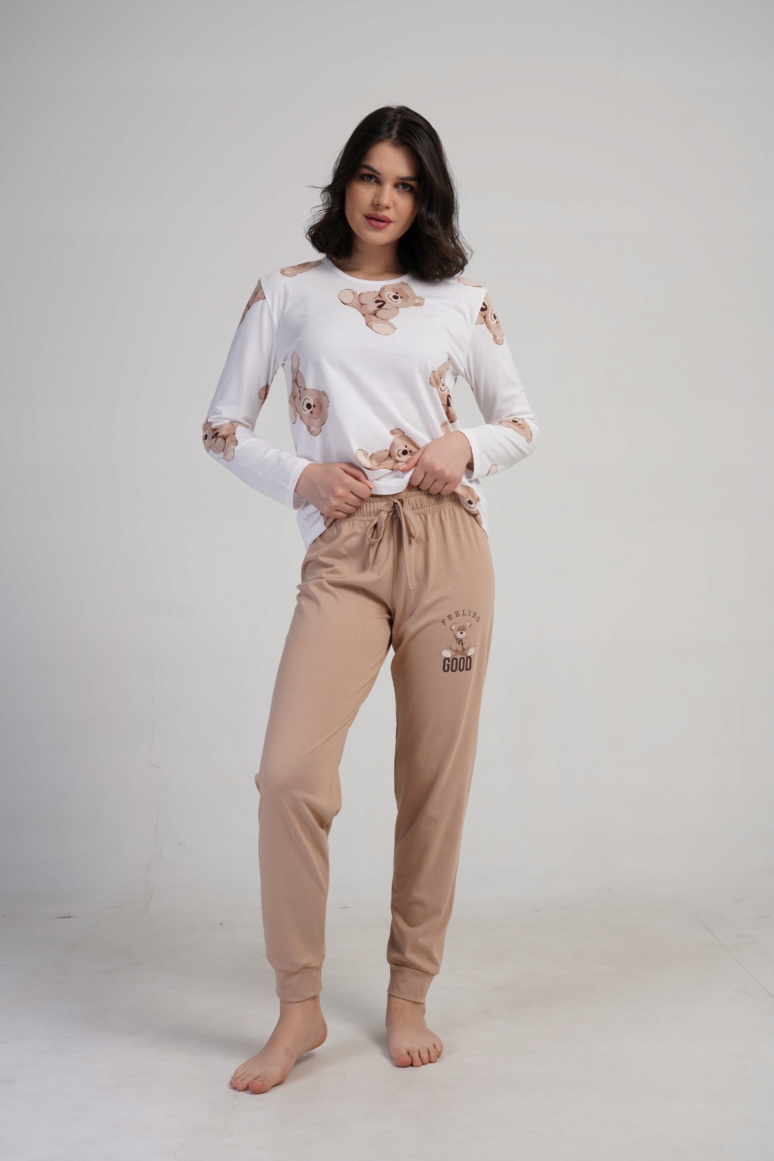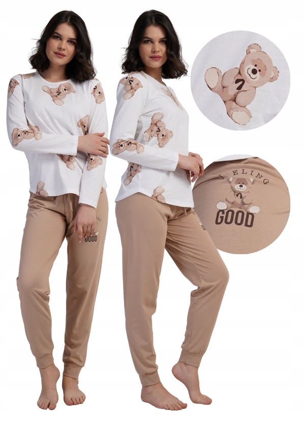 Ta urocza piżama damska to idealne połączenie wygody i słodkiego designu. Bluzka w białym kolorze została pokryta nadrukiem uroczych misiów, które wprowadzają do stylizacji odrobinę dziecięcego uroku. Beżowe spodnie z mankietami przy nogawkach i nadrukiem „Feeling Good” z misiem podkreślają spójny, przytulny charakter kompletu.