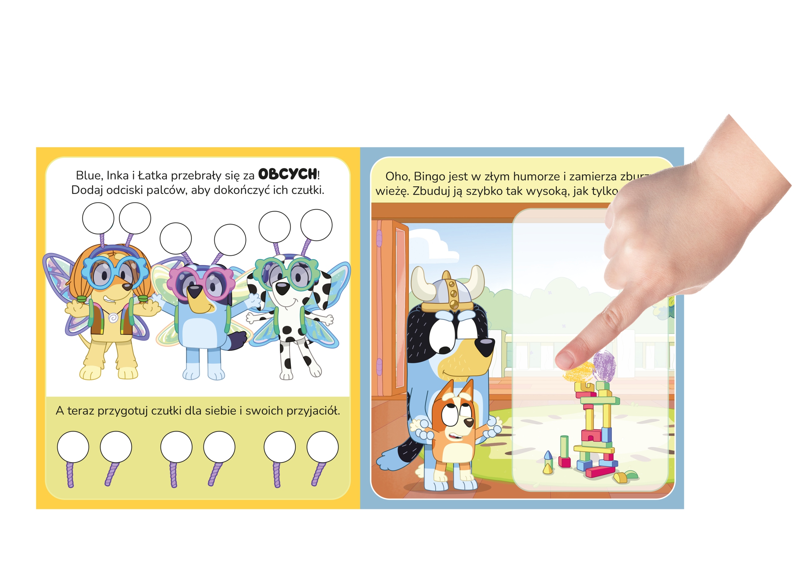 Bo tutaj wszystko zależy od nich! Każdy odcisk palca może zmienić się w pieska, piłkę, a nawet cały świat – wystarczy tylko wyobraźnia. Bluey i Bingo dodają energii i pomysłów na każdej stronie, sprawiając, że zabawa staje się jeszcze bardziej wciągająca.