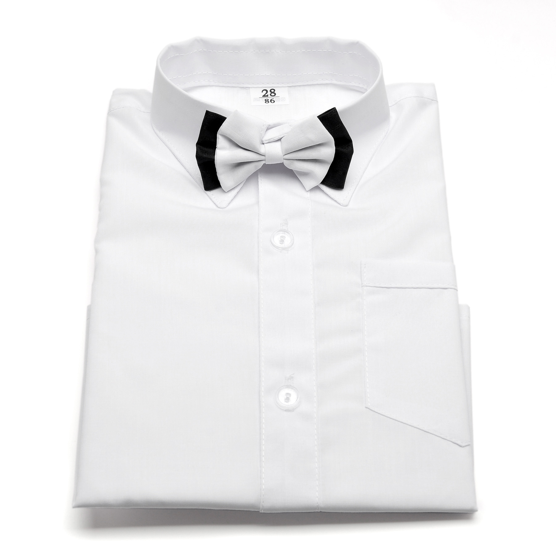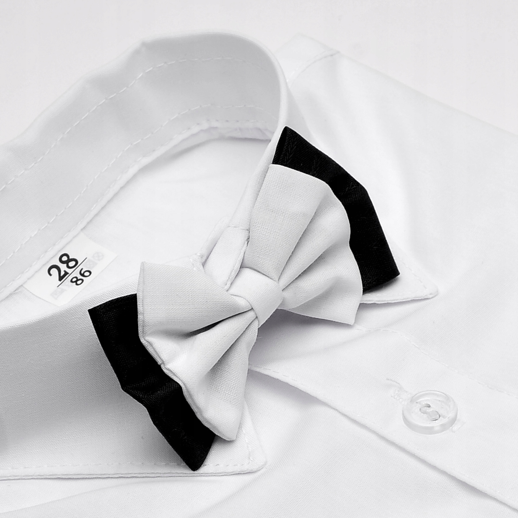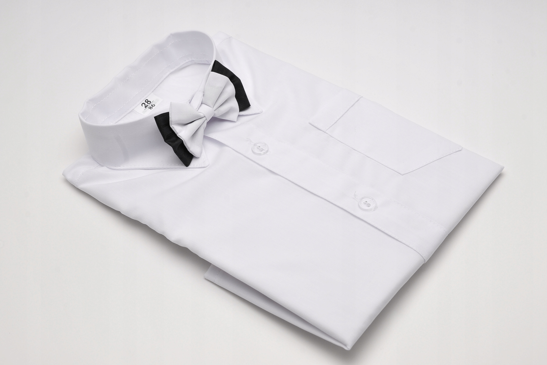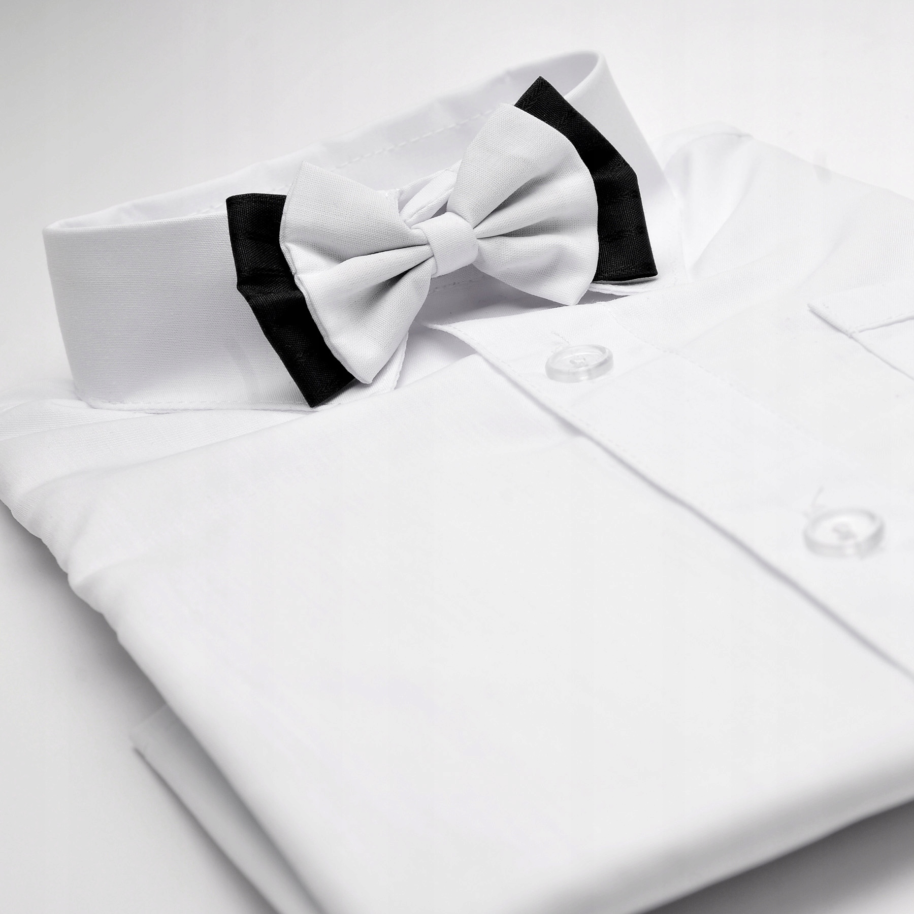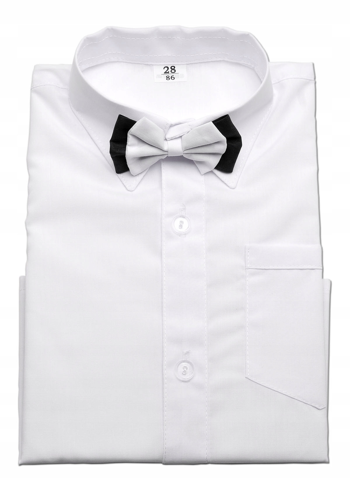 Elegancka koszula chłopięca z długim rękawem oraz z muszką na gumce. Posiada kieszonkę z przodu po lewej stronie. Idealnie nadaje się na wszelkiego rodzaju uroczystości szkolne, kościelne czy rodzinne.