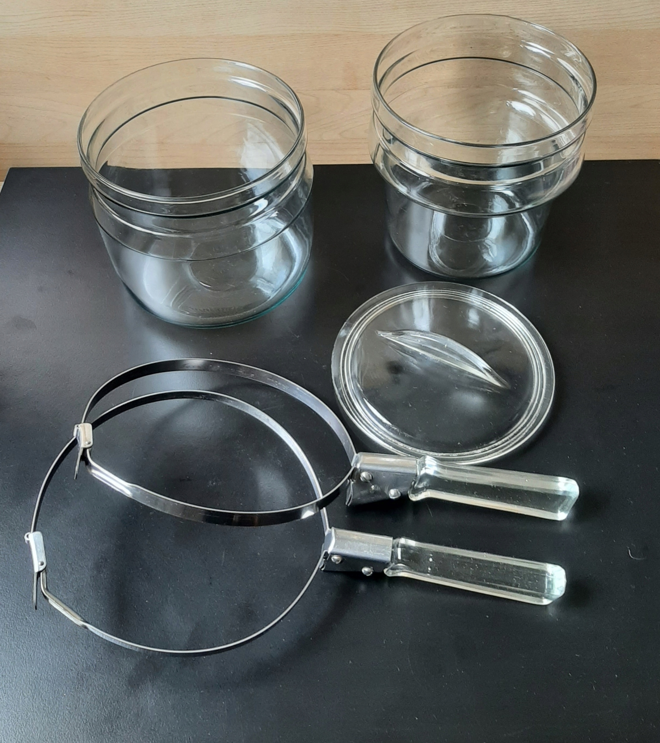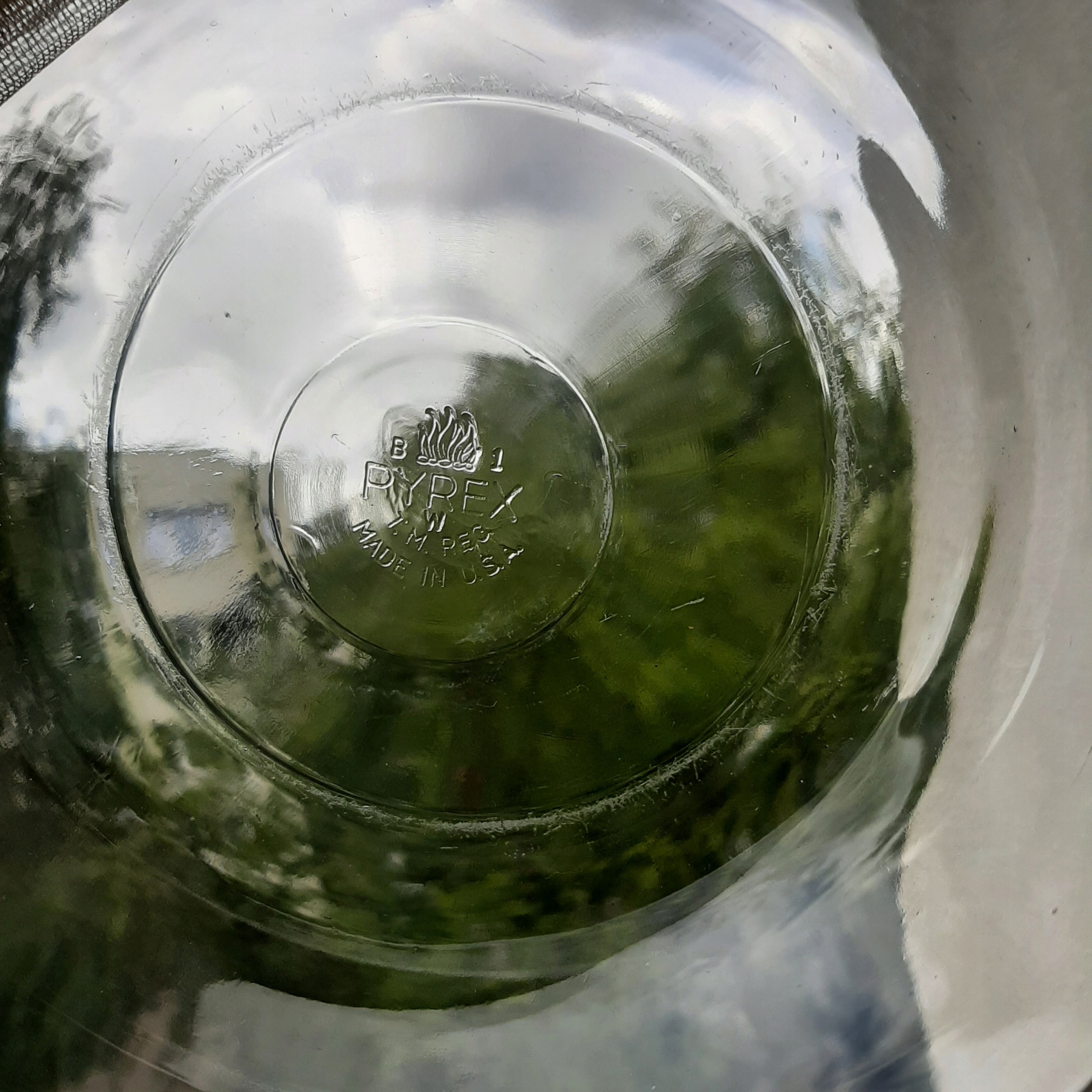 Wczesny egzemplarz, ma bardziej podstawową wersję logo Pyrex płomienia (Flameware) wtopioną w szkło, nie stempel oraz pokrywkę z płaskim uchwytem a nie okraglym.