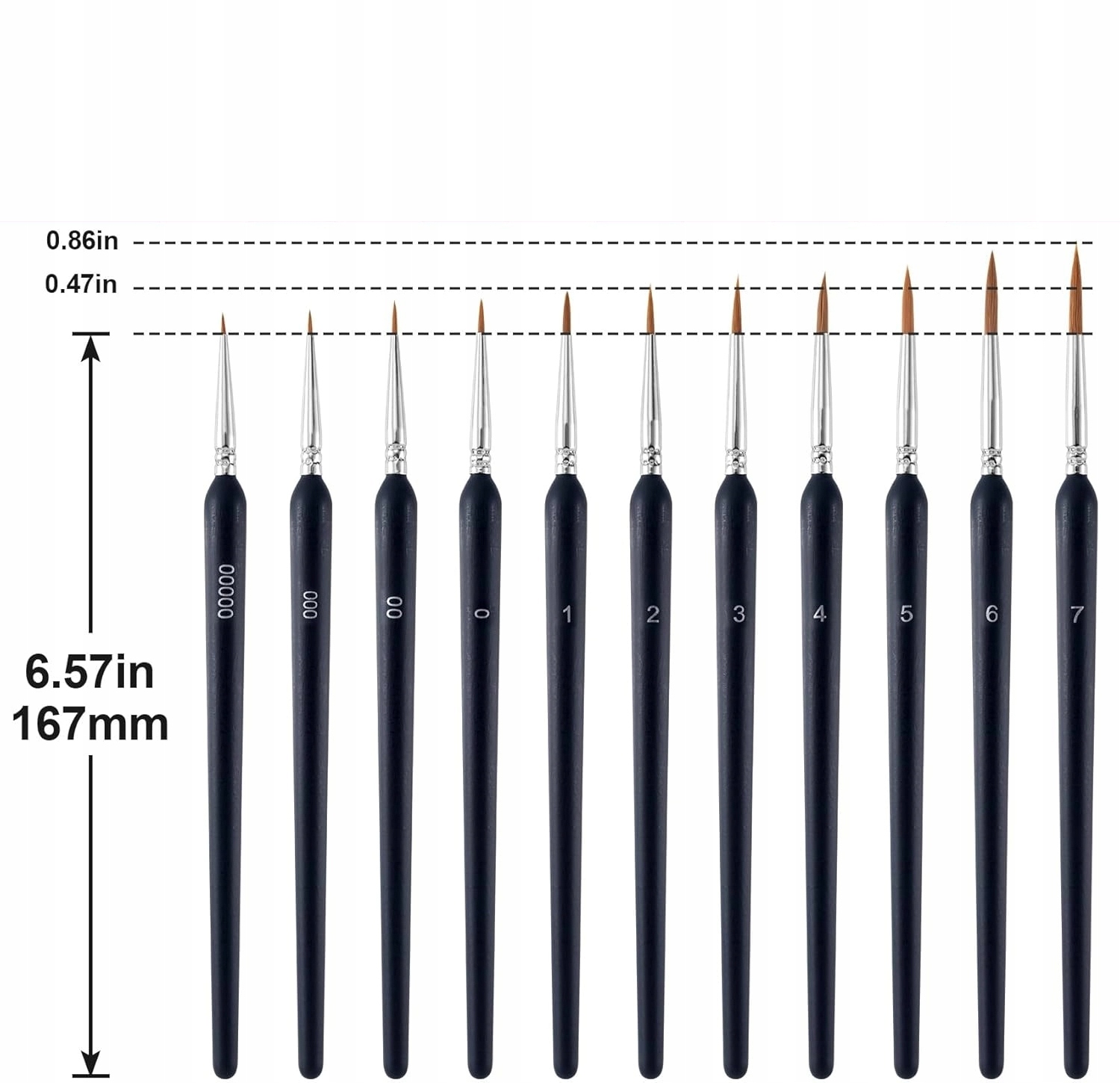 ➡️ Praktyczność: Zestaw składa się z 10 różnych pędzli o różnych rozmiarach (00000, 000, 00, 0, 1, 2, 3, 4, 5, 6, 7), spełniających różne potrzeby artystów.
