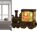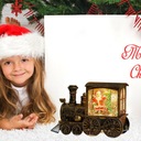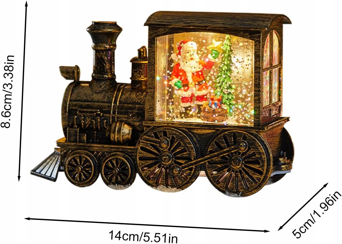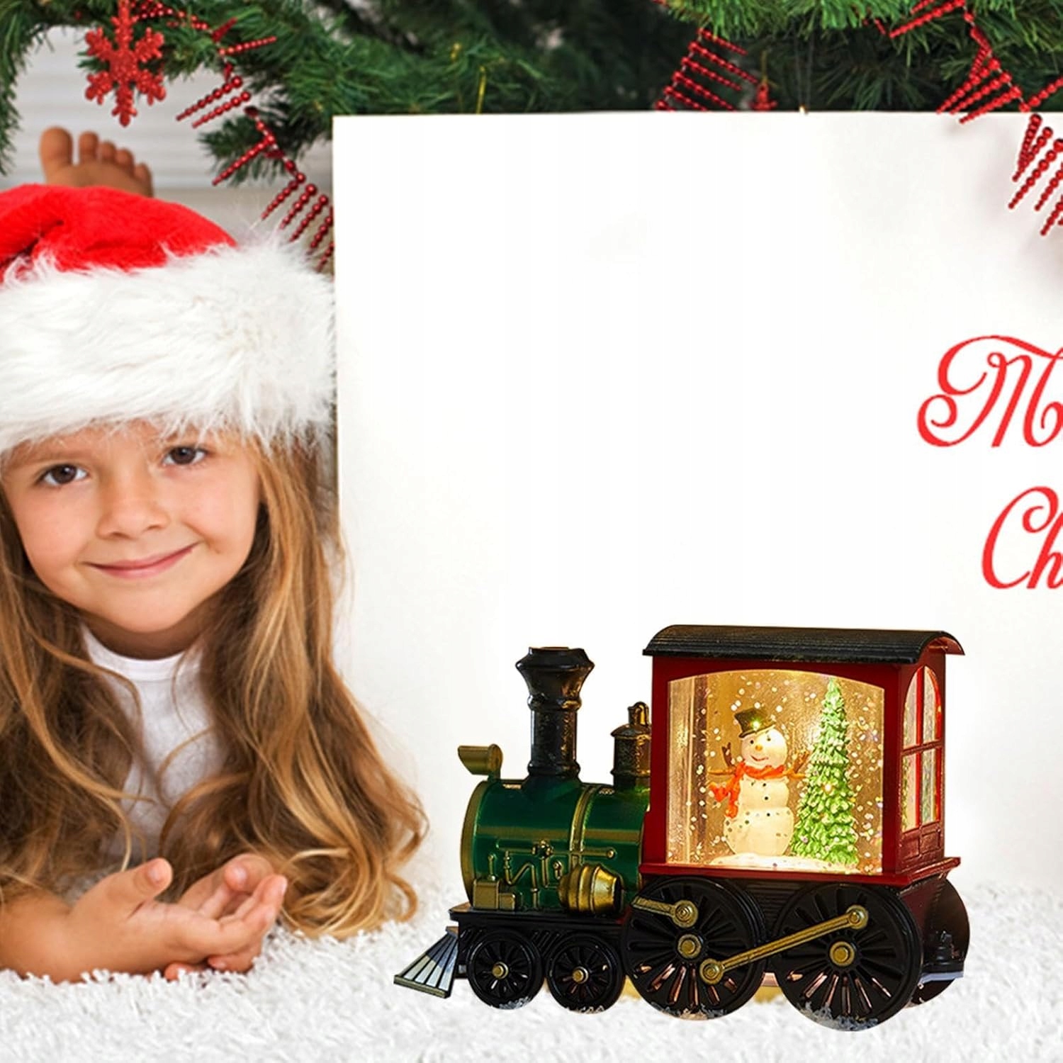 Nazwa produktu: świecąca kula śnieżna w kształcie świątecznego pociągu. Materiał produktu: żywica i PCW.