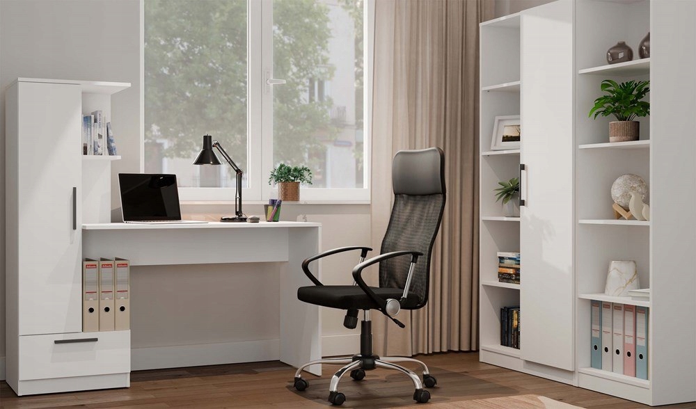 Стол с книжным шкафом COSMO White-это функциональный набор, сочетающий современный стиль с практичные решения для повседневного использования. Благодаря компактному дизайну комплект проверит в молодежной комнате, домашнем офисе или студии.