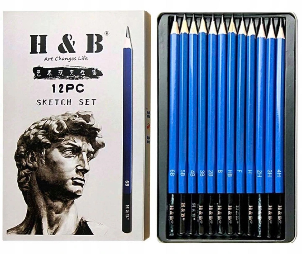 Карандаши-обозначаются цифрами или буквами, которые обычно обозначаются как степени твердости. Буква B означает, что они мягкие и подходят для эскизов и затенения, а буква H означает жесткий-они используются для рисования прямых линий и деталей. Комплект он содержит до 12 типов карандашей.