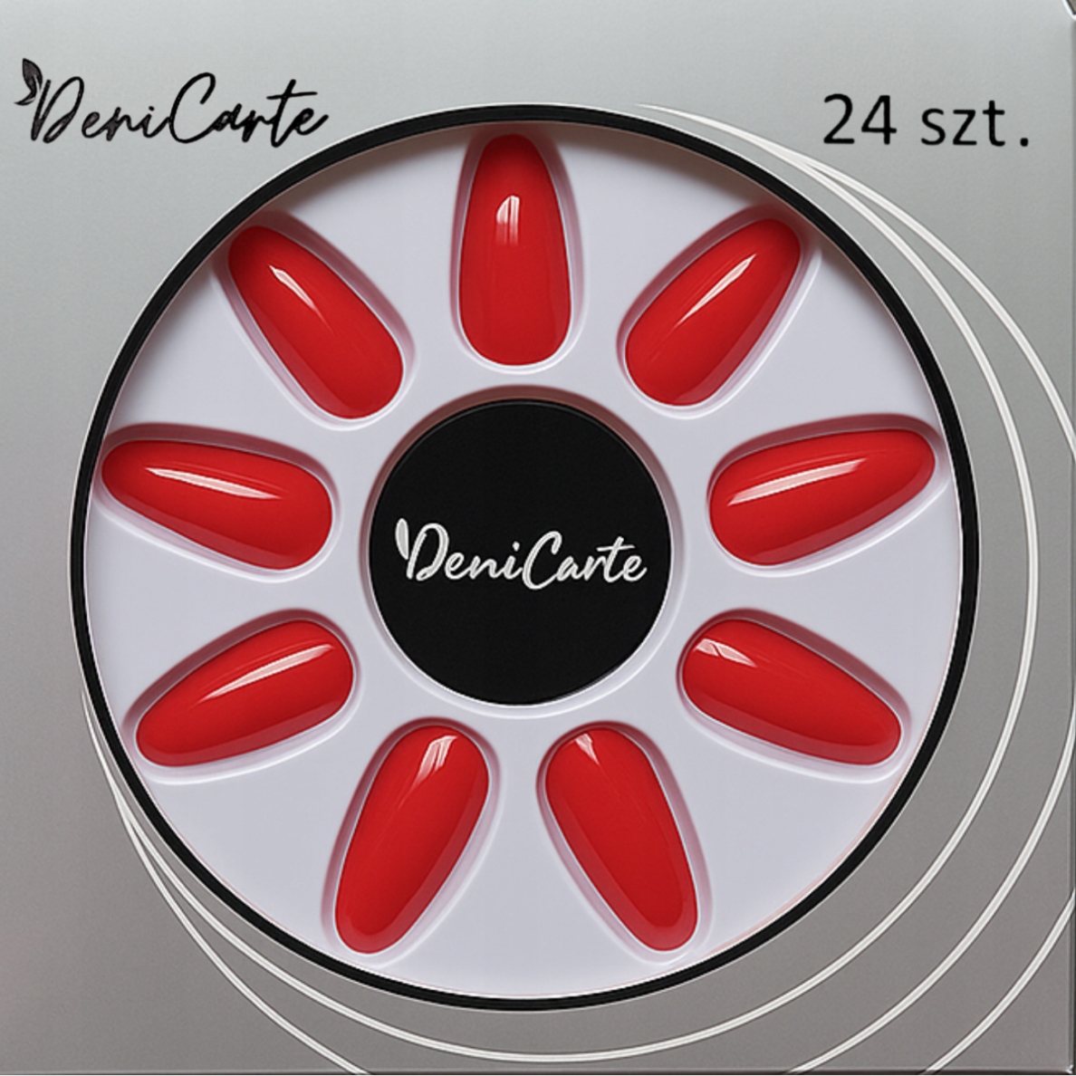 ✔️ Gotowe tipsy, paznokcie short almond. Naklejane sztuczne paznokcie zdobione w kształcie krótkiego migdałka. Paznokcie wyróżniają się klasycznym, jednolitym kolorem czerwonym.