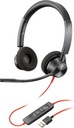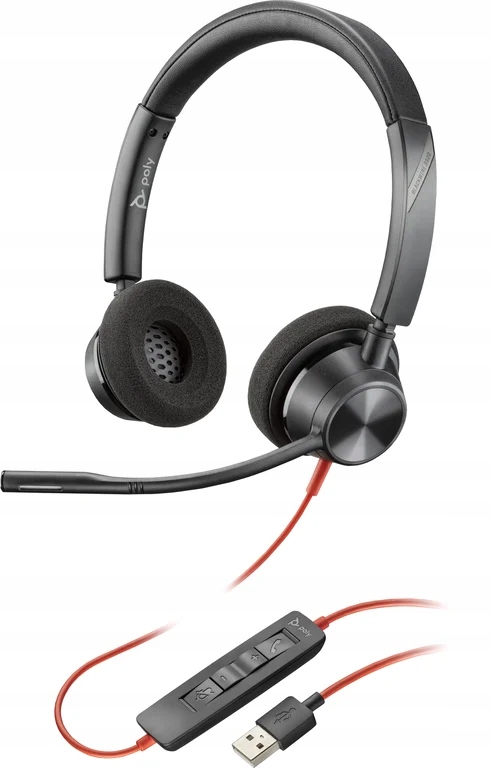 Poly Zestaw słuchawkowy Blackwire 3320 USB-A. Typ produktu: Zestaw słuchawkowy. Technologia łączności: Przewodowa. Rekomendowane użycie: Biuro/centrum telefoniczne, Długość kabla: 2,18 m. Waga produktu: 130 g. Kolor produktu: Czarny