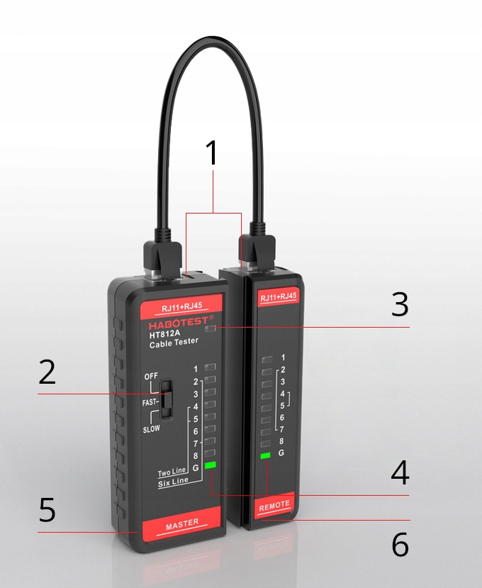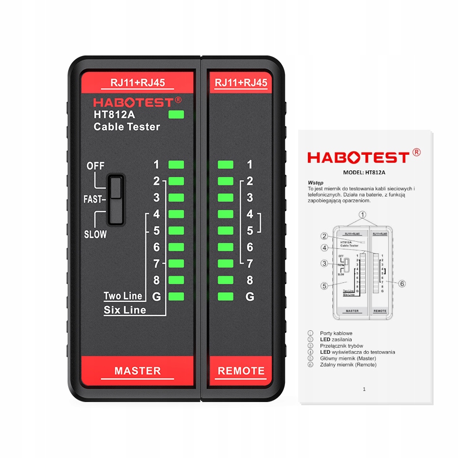 Habotest HT812A to niezawodne narzędzie do szybkiego i precyzyjnego testowania przewodów sieciowych oraz telefonicznych. Dzięki obsłudze złączy RJ11 i RJ45 oraz możliwości testowania różnych konfiguracji kabli, urządzenie sprawdzi się zarówno w profesjonalnych instalacjach, jak i w domowym użytku.