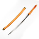 Wykonana z solidnego metalu katana odzwierciedla wysokotechnologiczny styl broni używanej przez Judy Alvarez. Uchwyt pokryty jest intensywnie pomarańczowym kolorem z teksturowanym chwytem, a czerwone kanji nadają całości charakteru i kontekstu. Ostrze lśni srebrnym wykończeniem z grawerowanymi znakami i japońskim tekstem, co podkreśla jego futurystyczny charakter. Złote akcenty na jelcu i zakończeniach pochwy dodają elegancji, a całość dopełnia dopasowana, pomarańczowa pochwa, tworząc jednolitą i stylową kompozycję.