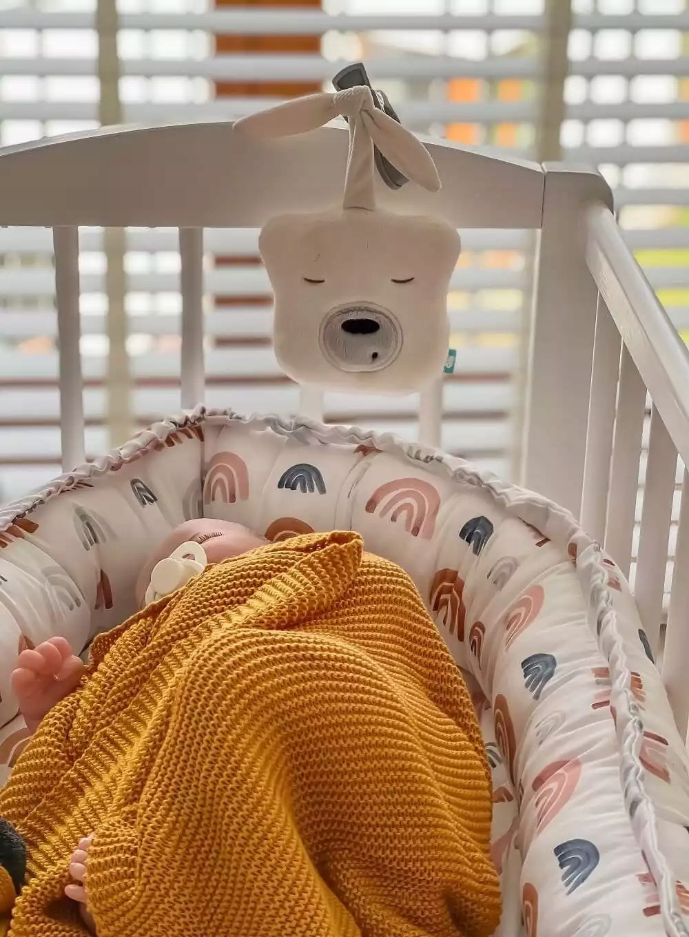 Szumiś zawieszka szumi tak jak duży miś, ale jest mniejszy, przenośny i ma wygodną klamrę. Dzięki niej Szumisia mini można z łatwością przyczepić do dziecięcego łóżeczka albo zabrać na spacer w wózeczku czy w podróż w foteliku samochodowym.