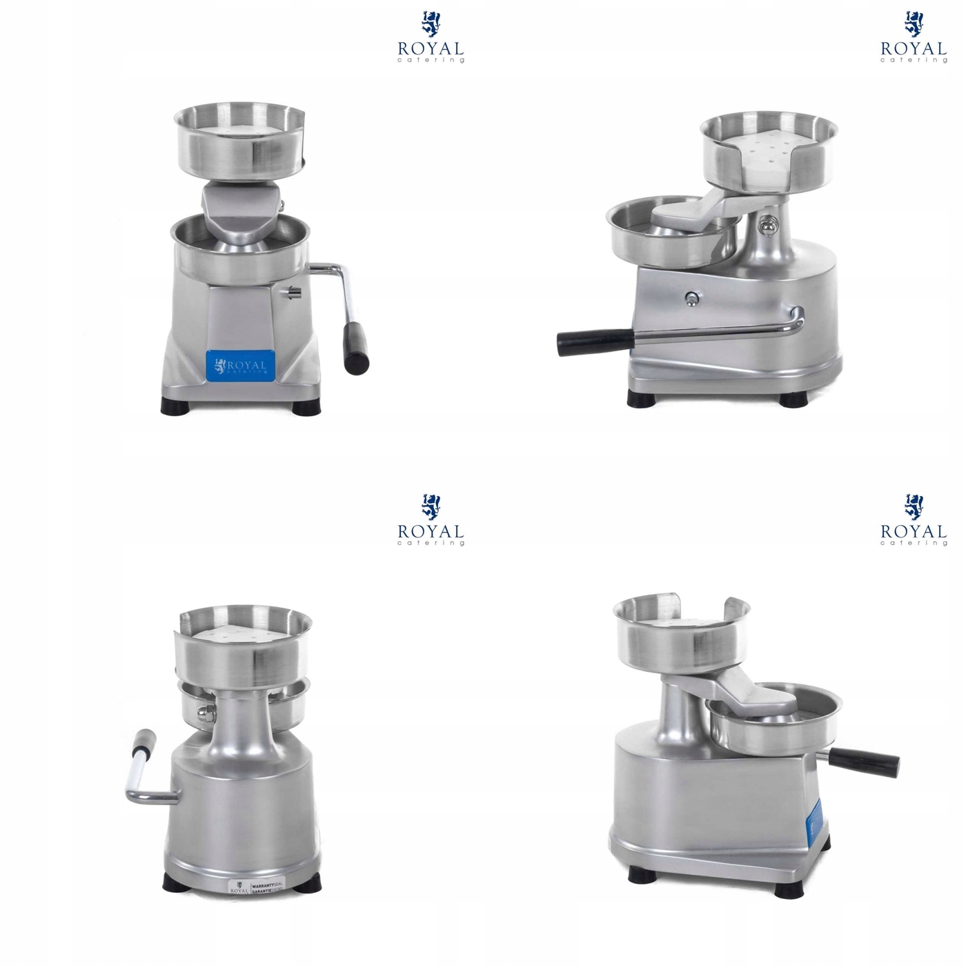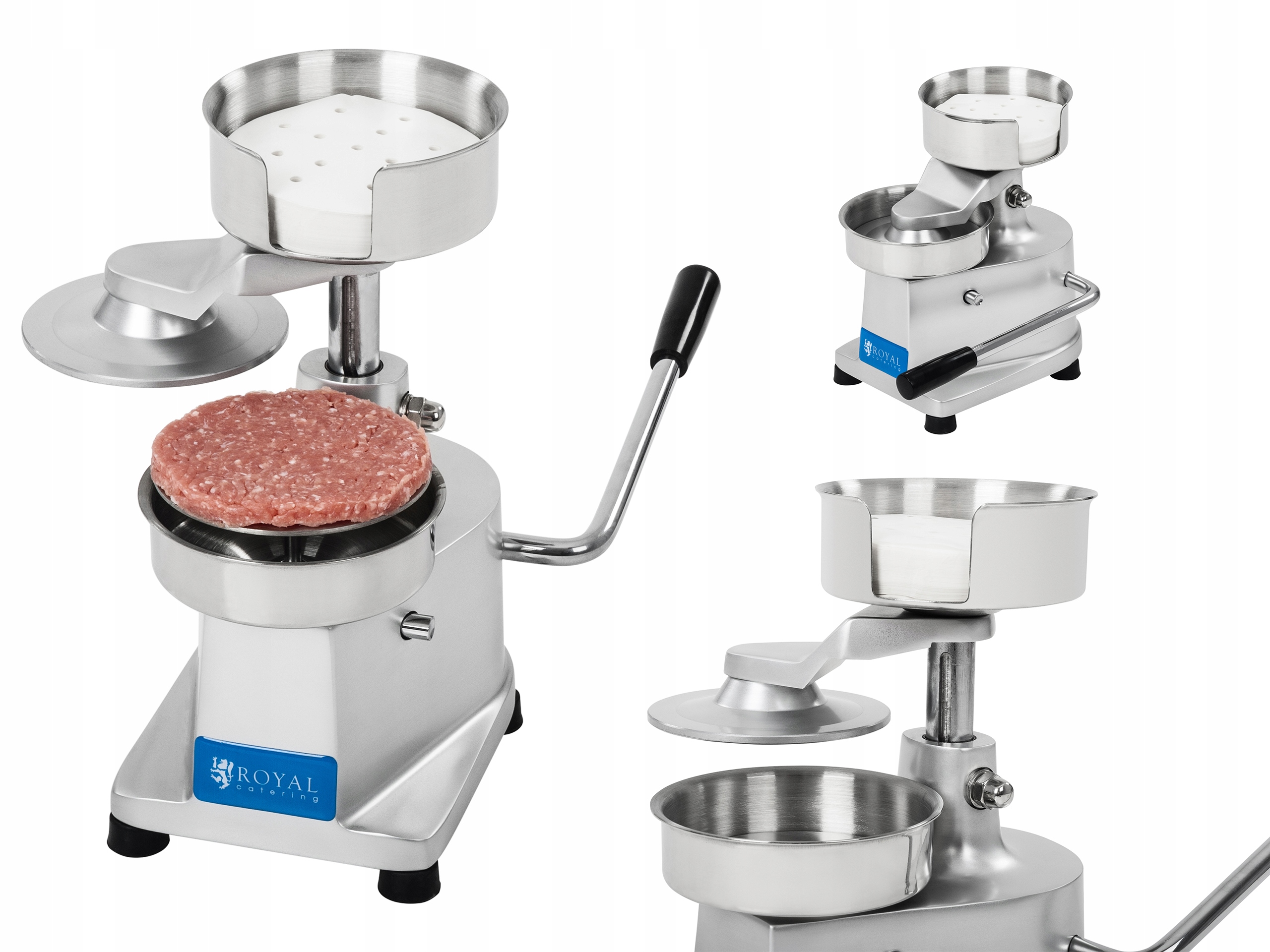 Maszynka do robienia hamburgerów marki Royal Catering sprawdzi się w branży gastronomicznej. Umożliwi sprawne formowanie mięsnych, rybnych lub warzywnych burgerów w restauracjach i punktach gastronomicznych serwujących tego typu posiłki. Urządzenie posiada certyfikat CE wymagany przez Sanepid.