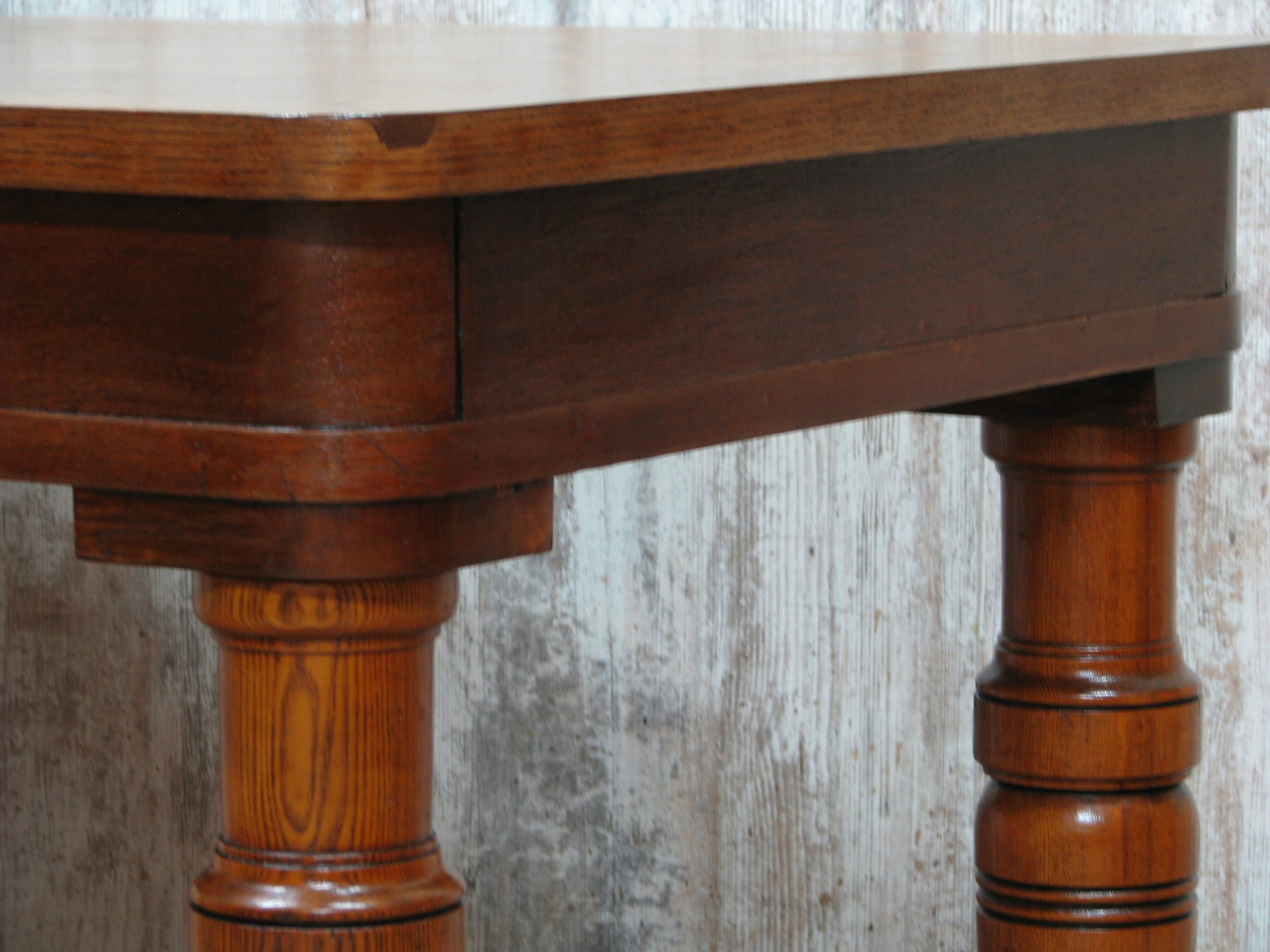 Uwidoczniona oryginalna piękna faktura starego drewna, mebel wykonany z litego drewna dębowego pięknymi dużymi toczonymi nogami na blacie delikatne ryski . Stół bardzo praktyczny łatwy w przenoszeniu nogi odkręcane z oryginalnym drewnianym gwintem .