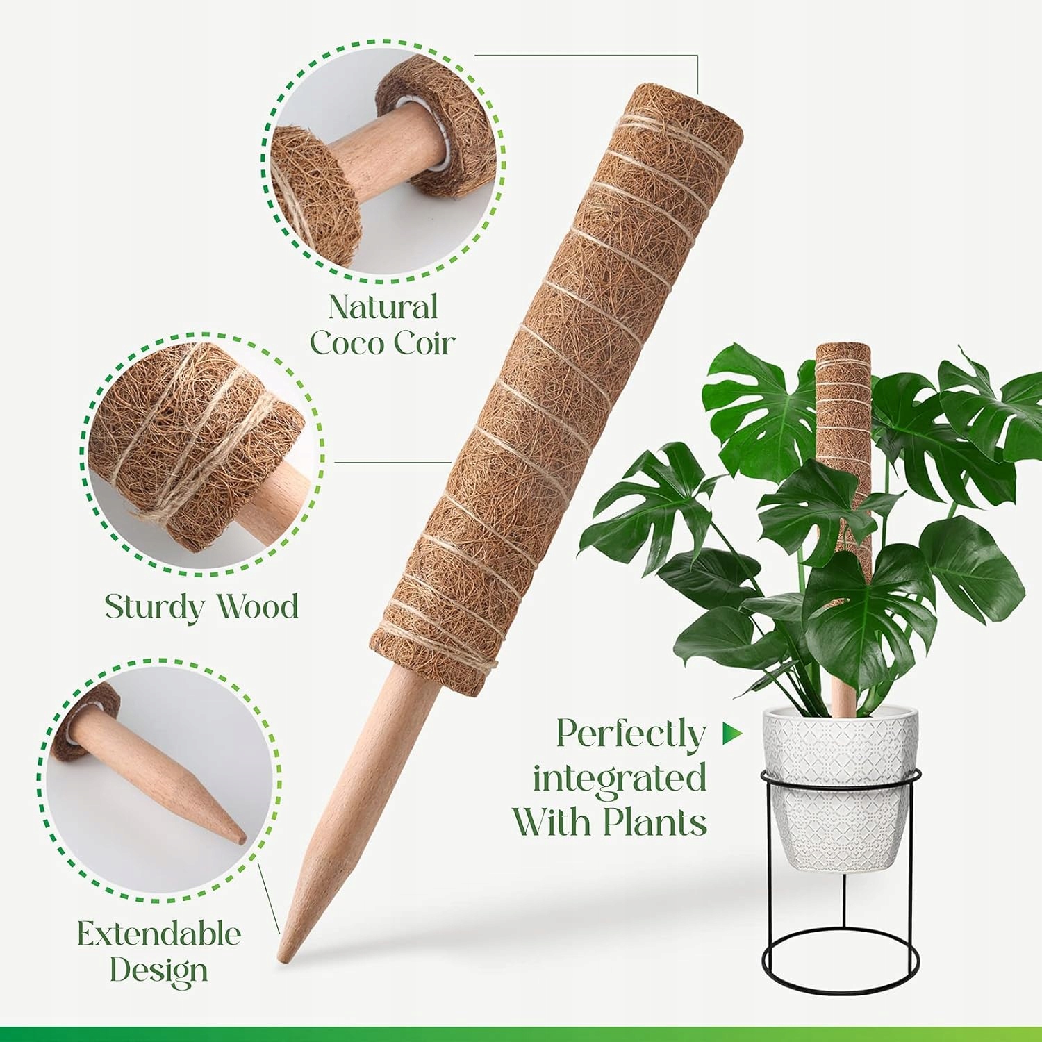 Naturalne włókno kokosowe: W naturalna podpórka do roślin kokosowych Monstera z włókien kokosowych zachwyca wysokiej jakości wykonaniem i naturalnym urokiem włókien kokosowych. Jedyny w swoim rodzaju plecionka nadaje pomieszczeniu naturalny i estetyczny wygląd, podczas gdy Twoje rośliny zyskają elegancką przestrzeń do wzrostu.
