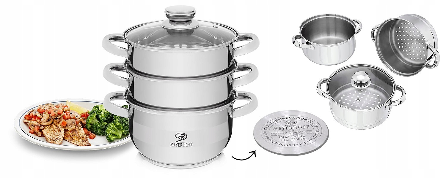Garnek renomowanej marki Meyerhoff wykonany z wysokiej jakości stali nierdzewnej idealnie nadaje się do codziennego gotowania dietetycznych posiłków dla osób ceniących zdrowy tryb życia. W garnku na parze przygotujemy mięso czy warzywa w sposób, który nie wymaga tłuszczu do ich obróbki termicznej. Dzięki temu, dania zachowają maksimum witamin i soli mineralnych oraz naturalny smak i aromat. Dwa wkłady parowe pozwalają na przygotowanie kilku potraw jednocześnie.