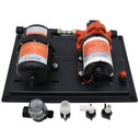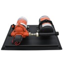 POMPA WODY CIŚNIENIOWA 12V 11,3L/min + ZBIORNIK WYRÓWNAWCZY - Kompletny zestaw ciśnieniowy składa się z 3-komorowej pompy ciśnieniowej membranowej, filtra siatkowego i zbiornika ciśnieniowego z szybkozłączkami elektrycznymi. Pompa, zbiornik wyrównawczy i zaciski elektryczne, umieszczone są na płycie montowanej. Zaletą takiego rozwiązania, jest stabilne ciśnienie i zwiększona wydajność samozasysania. Dzięki temu zestaw wystarcza do zasilenia 3 lub więcej odbiorników wody. Pompa załącza się automatycznie w skutek spadku ciśnienia (odkręcenia kranu).